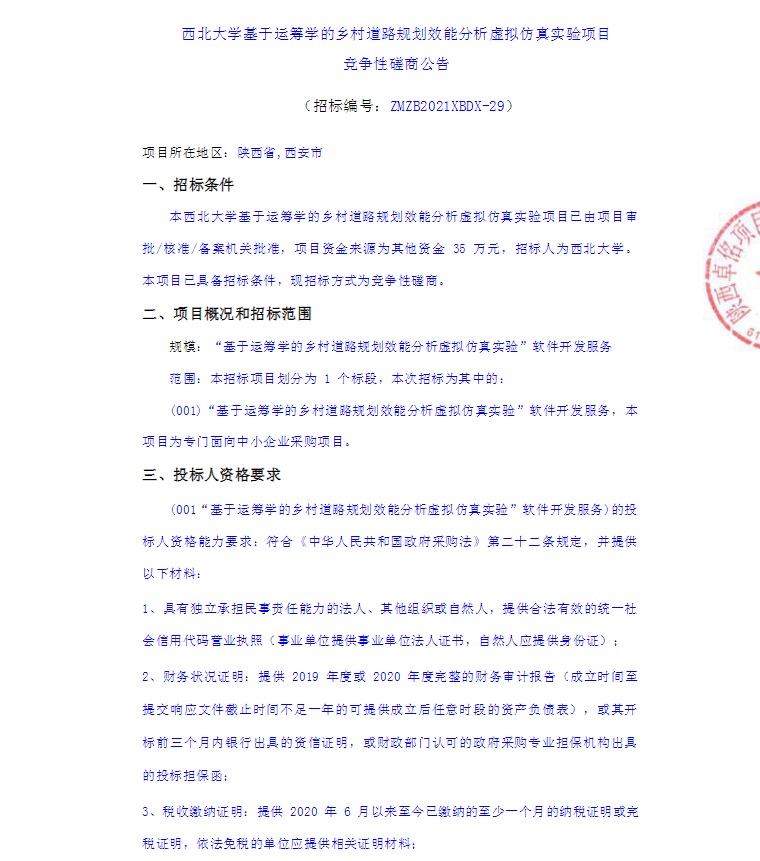 西北大学基于运筹学的乡村道路规划效能分析虚拟仿真实验项目竞争性磋商公告