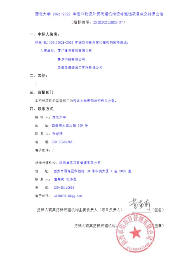 西北大学2021-2022年进口物资外贸代理机构资格遴选项目成交结果公告