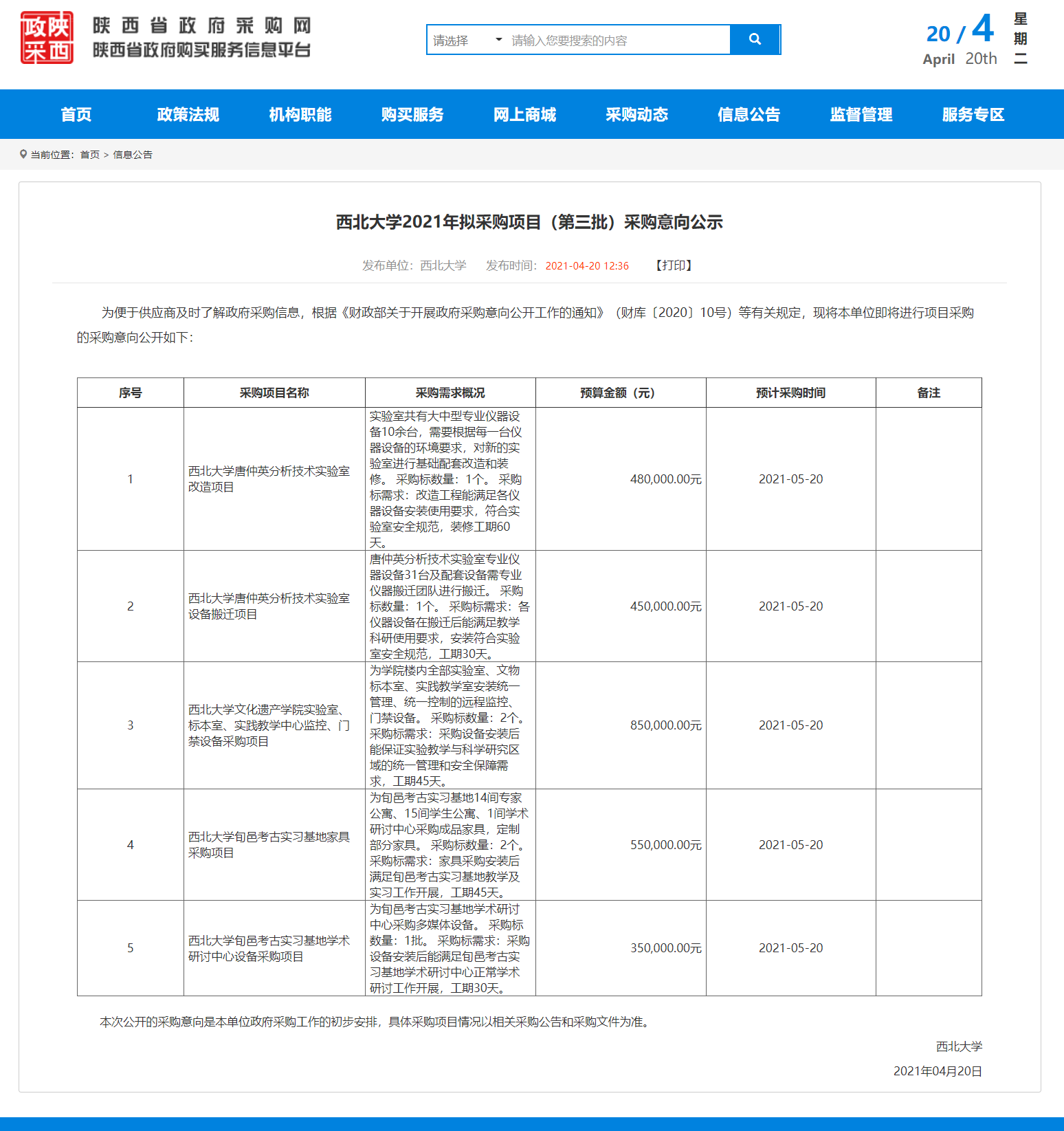 西北大学2021年拟采购项目(第三批)采购意向公示