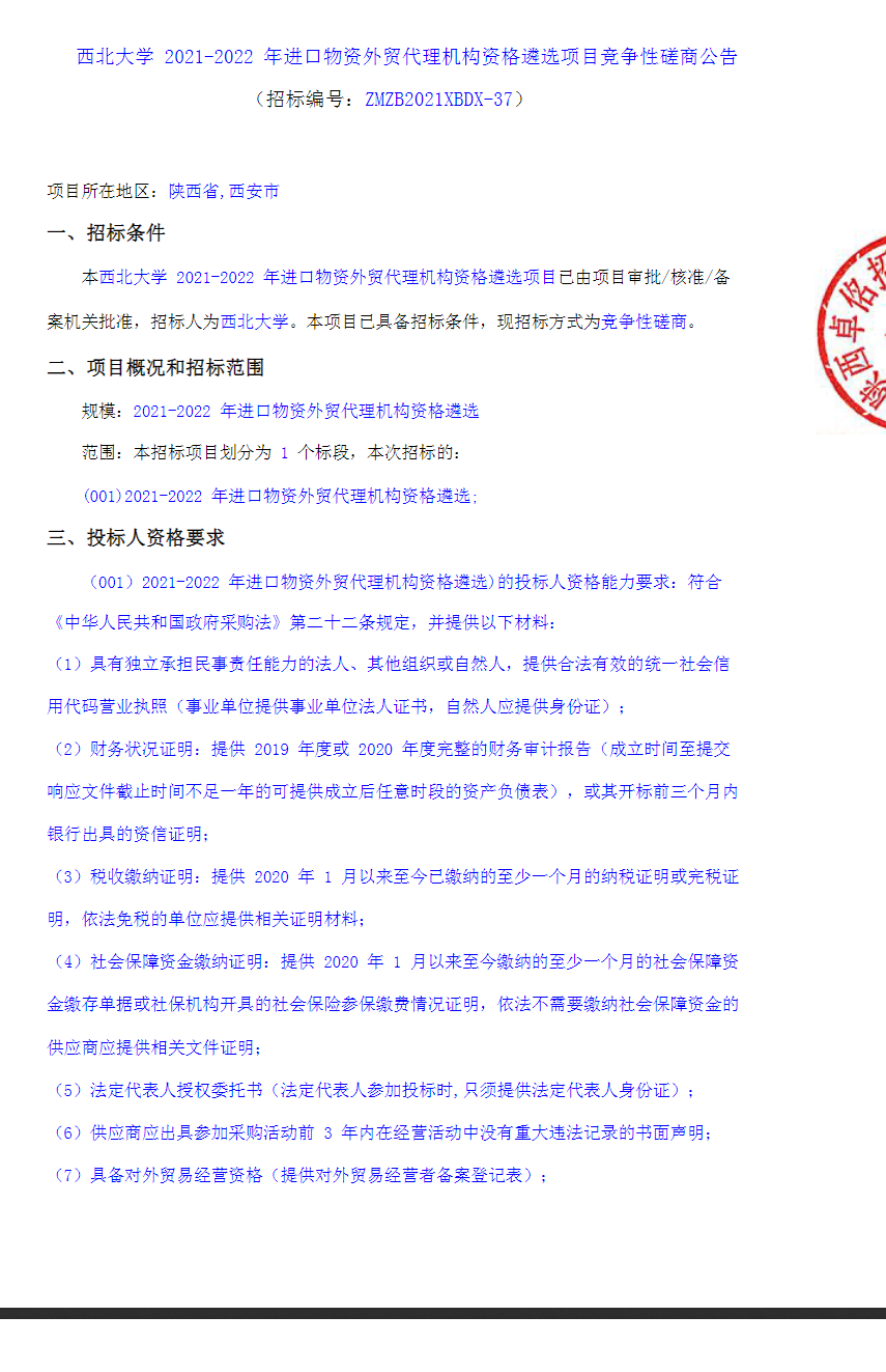 西北大学2021-2022年进口物资外贸代理机构资格遴选项目竞争性磋商公告