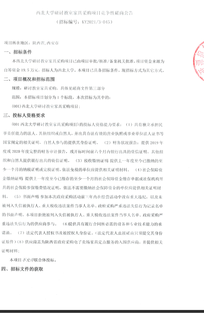 西北大学研讨教室家具采购项目竞争性磋商公告