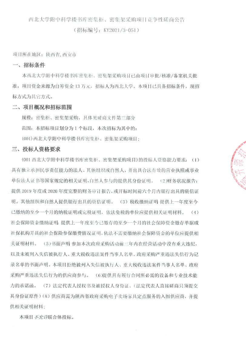 西北大学附中科学楼书库密集柜、密集架采购项目竞争性磋商公告