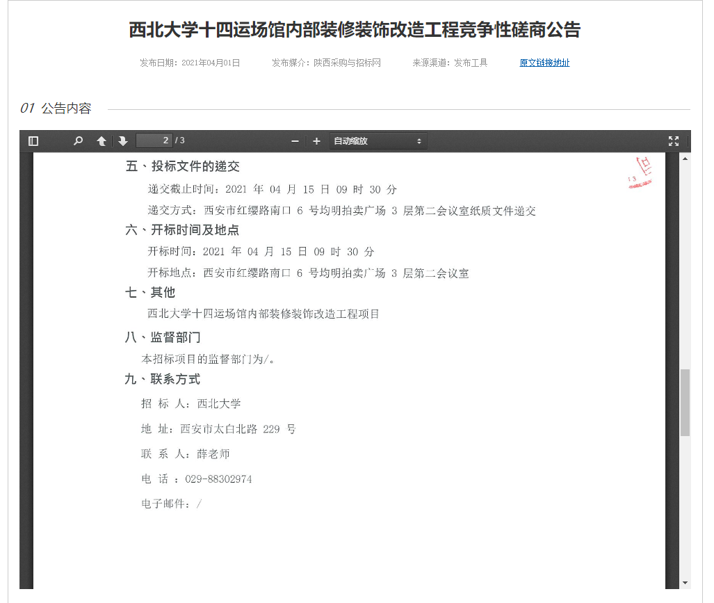 西北大学十四运场馆内部装修装饰改造工程竞争性磋商公告
