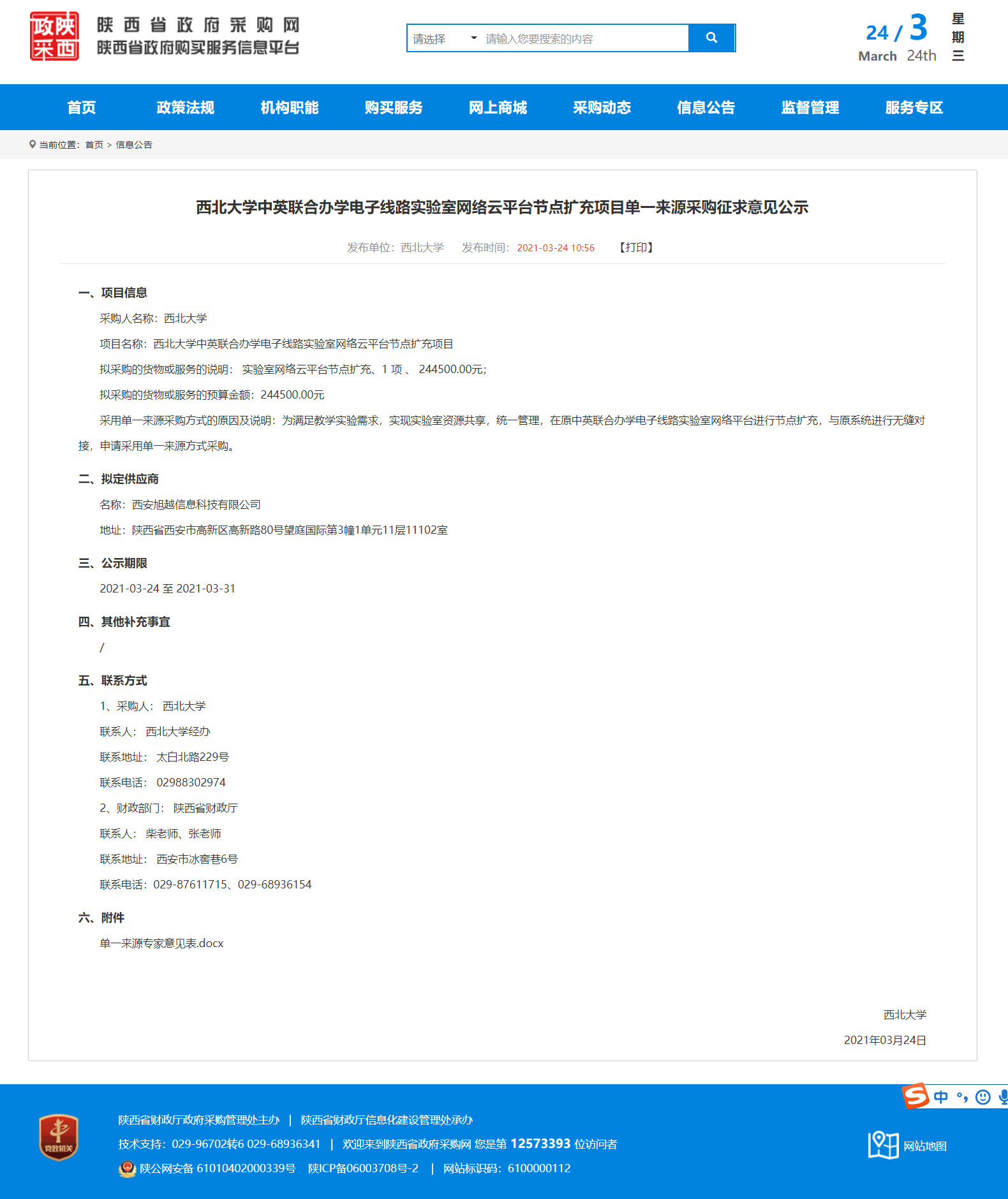西北大学中英联合办学电子线路实验室网络云平台节点扩充项目单一来源采购征求意见公示