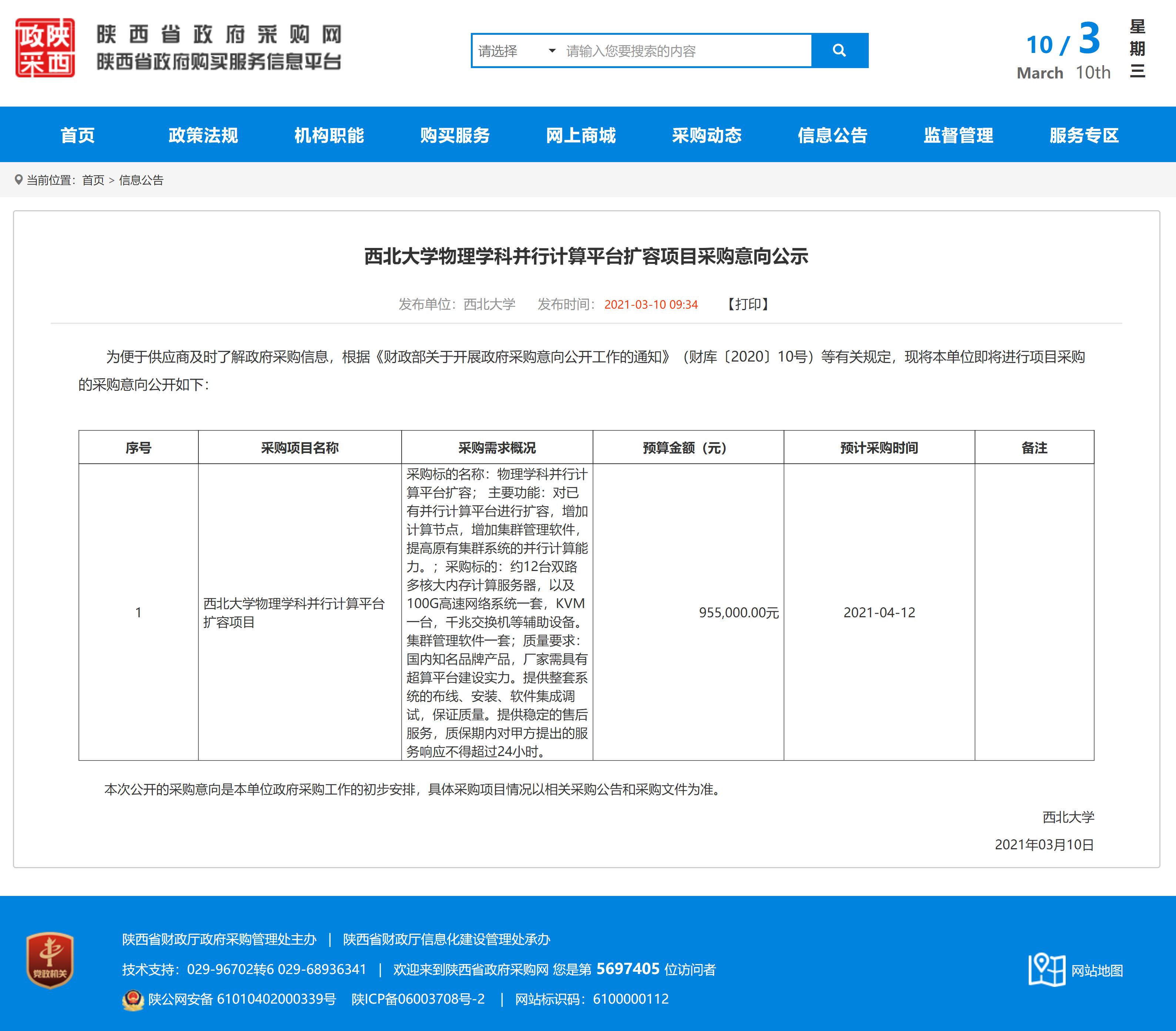 西北大学物理学科并行计算平台扩容项目采购意向公示