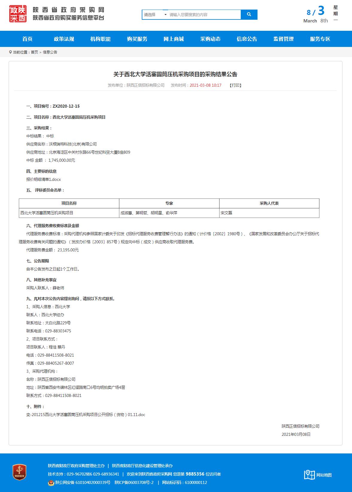 西北大学活塞圆筒压机采购项目的采购结果公告