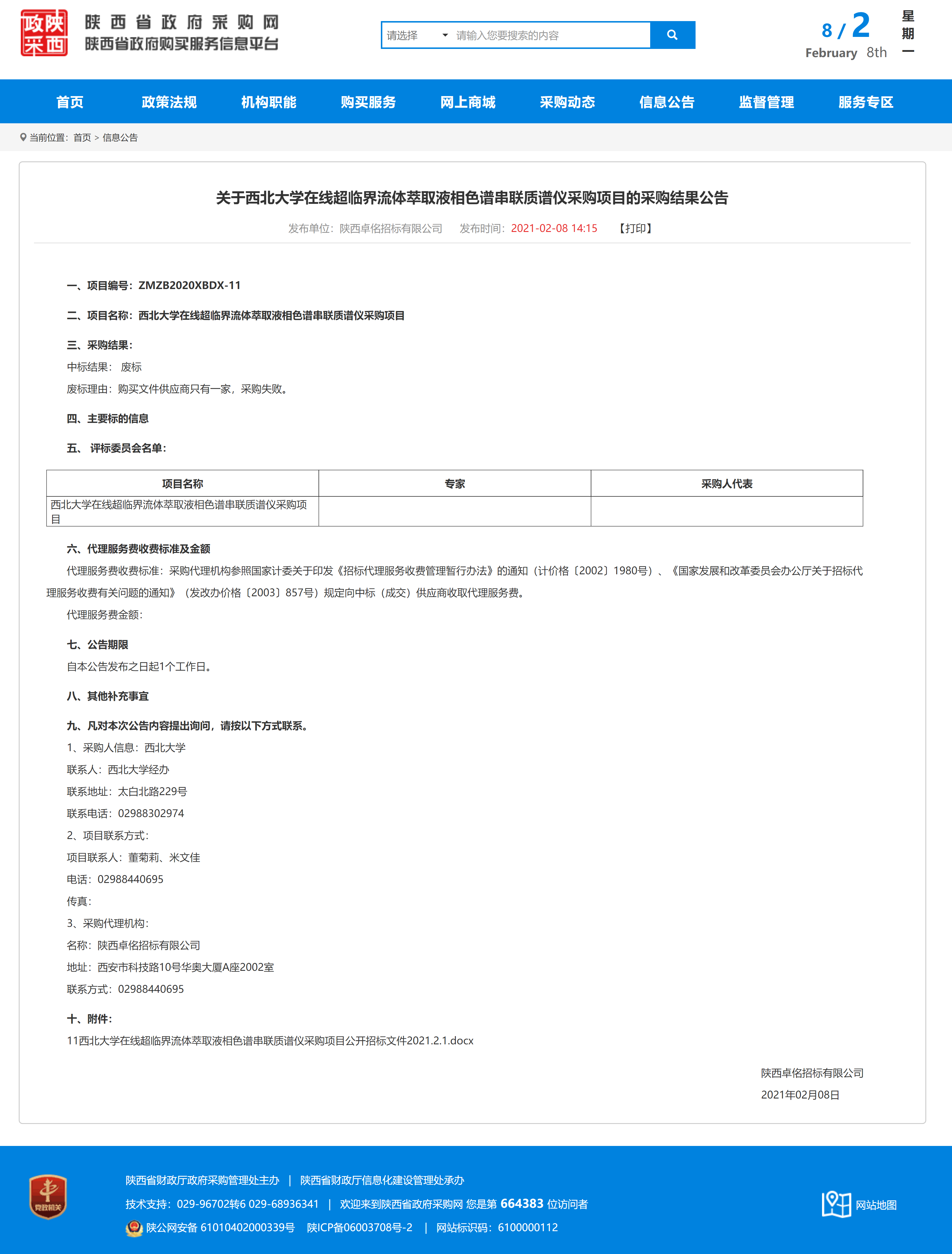 西北大学在线超临界流体萃取液相色谱串联质谱仪采购项目的采购结果公告