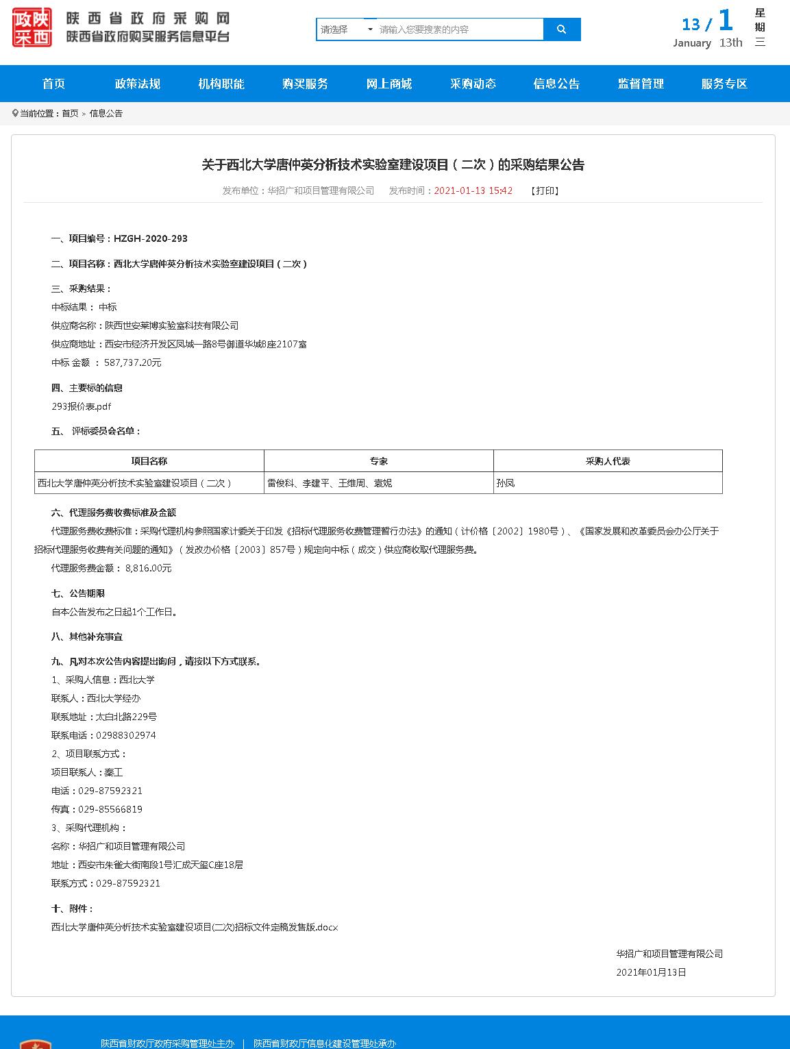 关于西北大学唐仲英分析技术实验室建设项目(二次)的采购结果公告