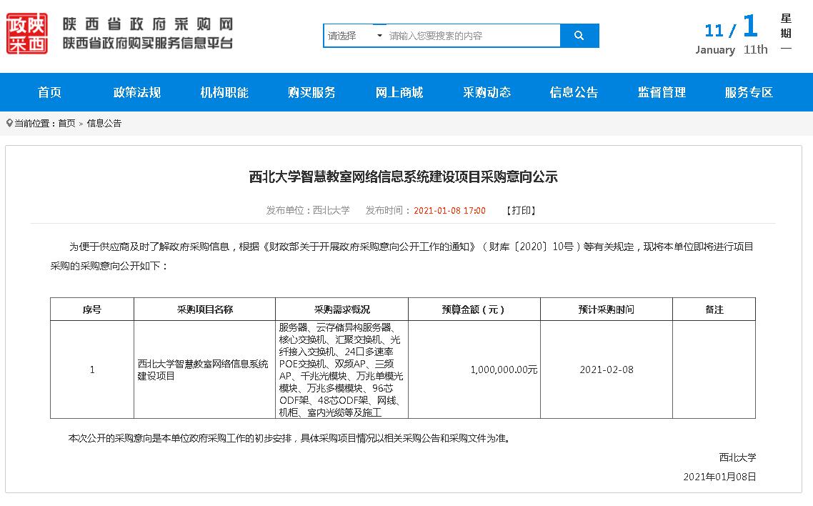 西北大学智慧教室网络信息系统建设项目采购意向公示