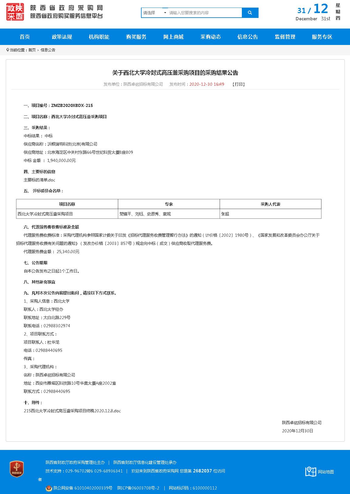 西北大学冷封式高压釜采购项目的采购结果公告