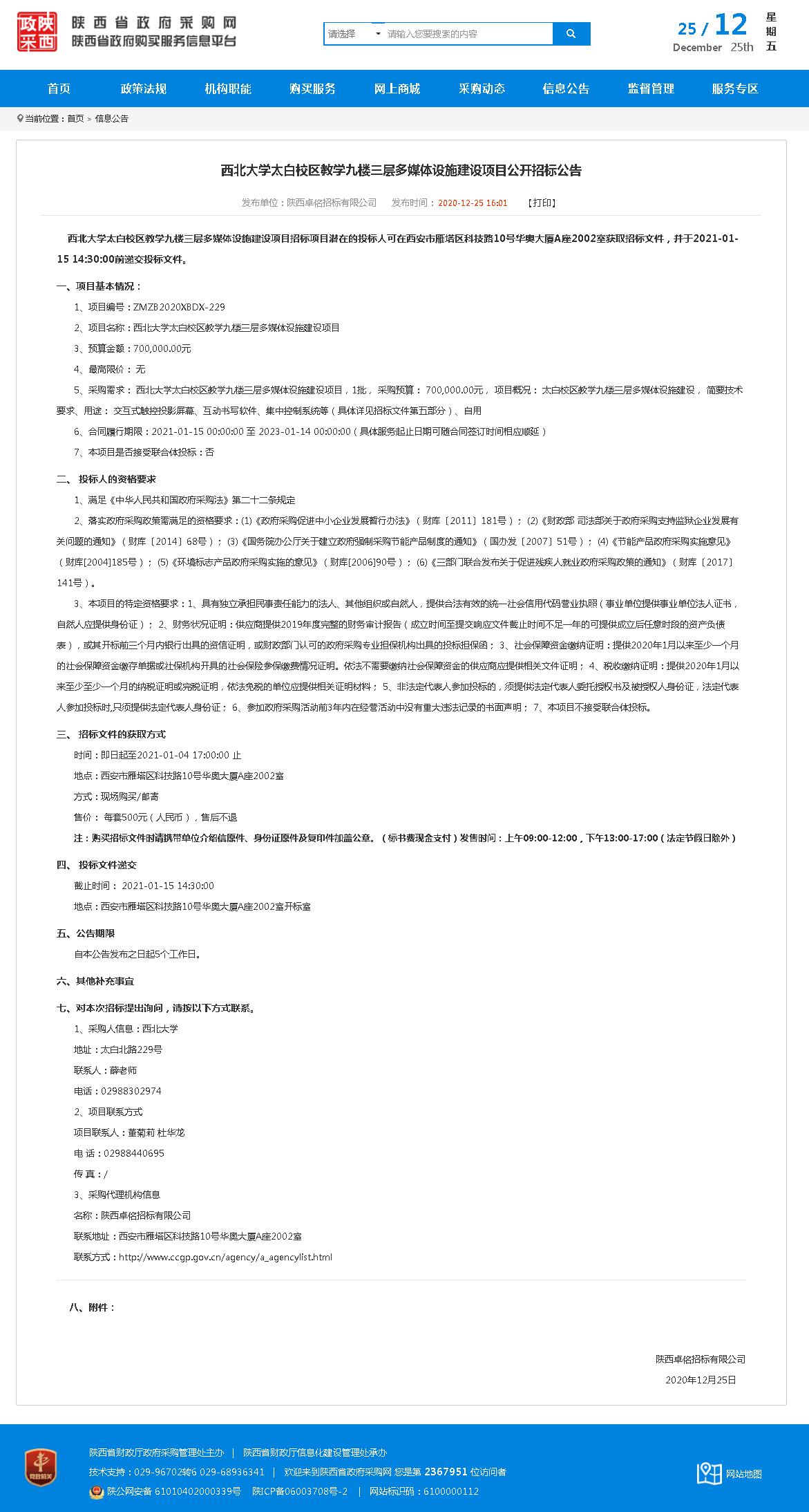 西北大学太白校区教学九楼三层多媒体设施建设项目公开招标公告