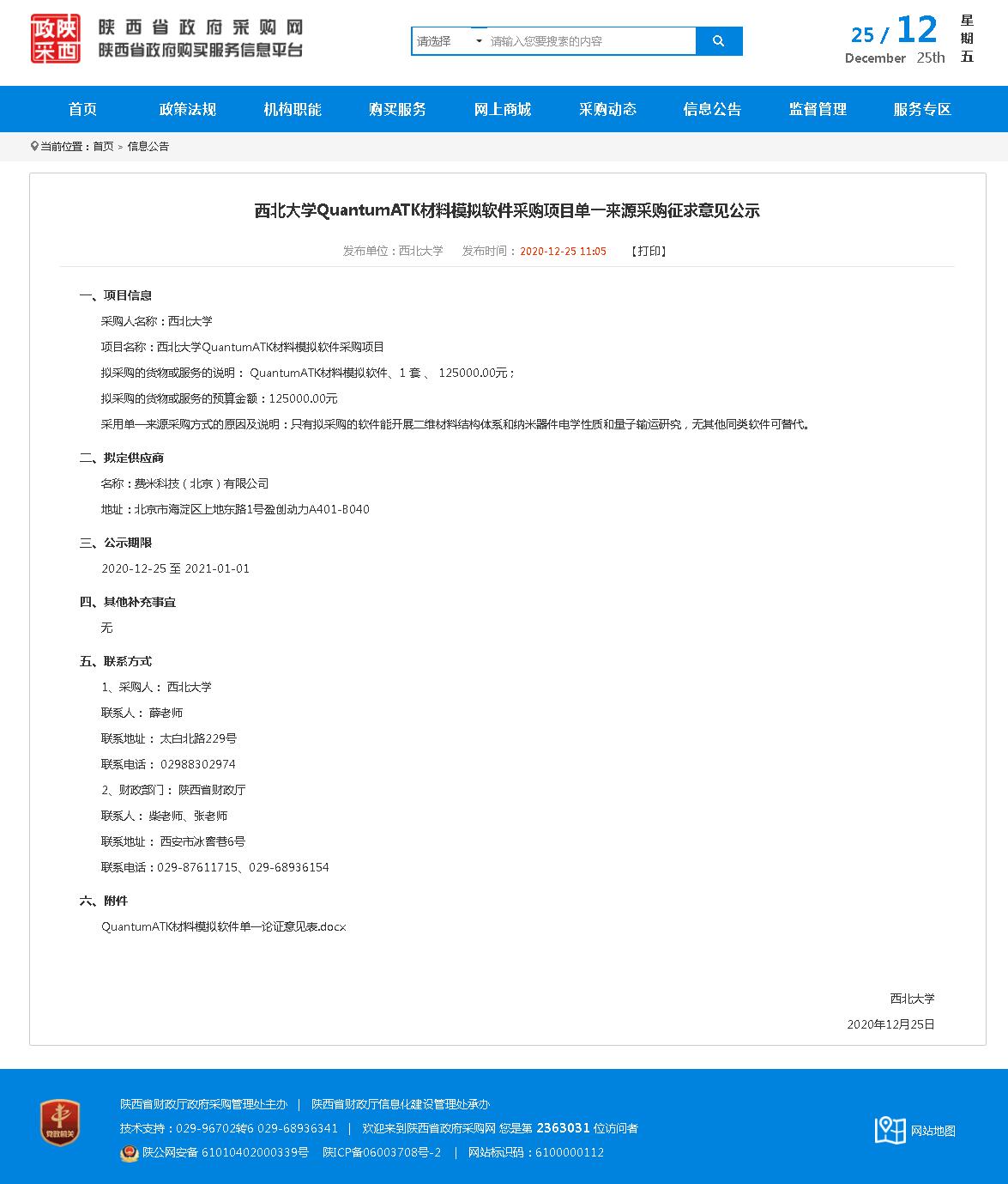 西北大学QuantumATK材料模拟软件采购项目单一来源采购征求意见公示