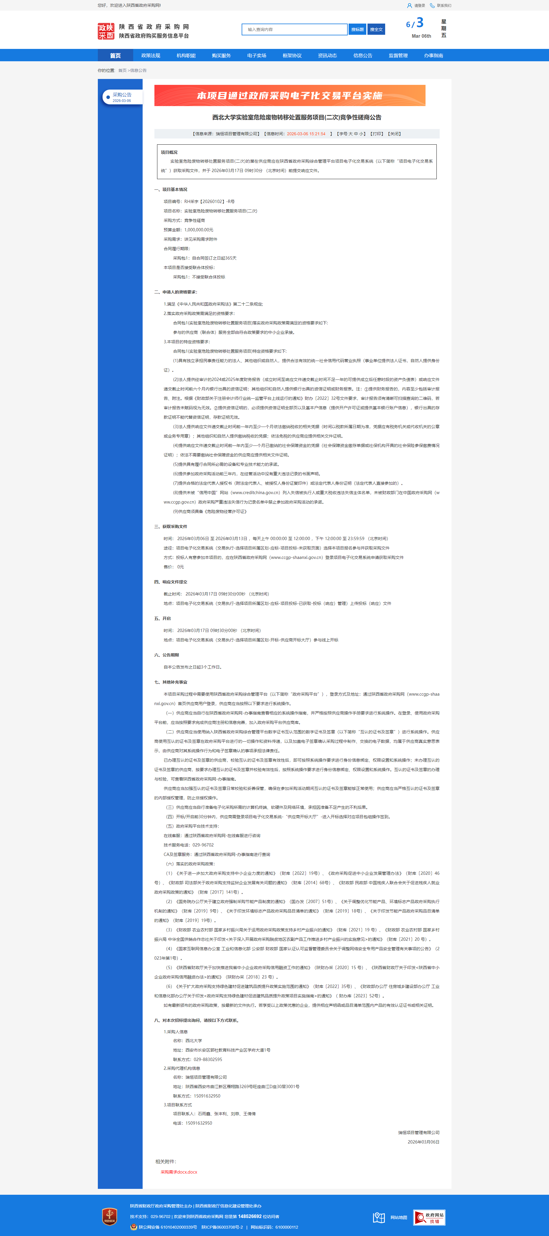 西北大学实验室危险废物转移处置服务项目(二次)竞争性磋商公告