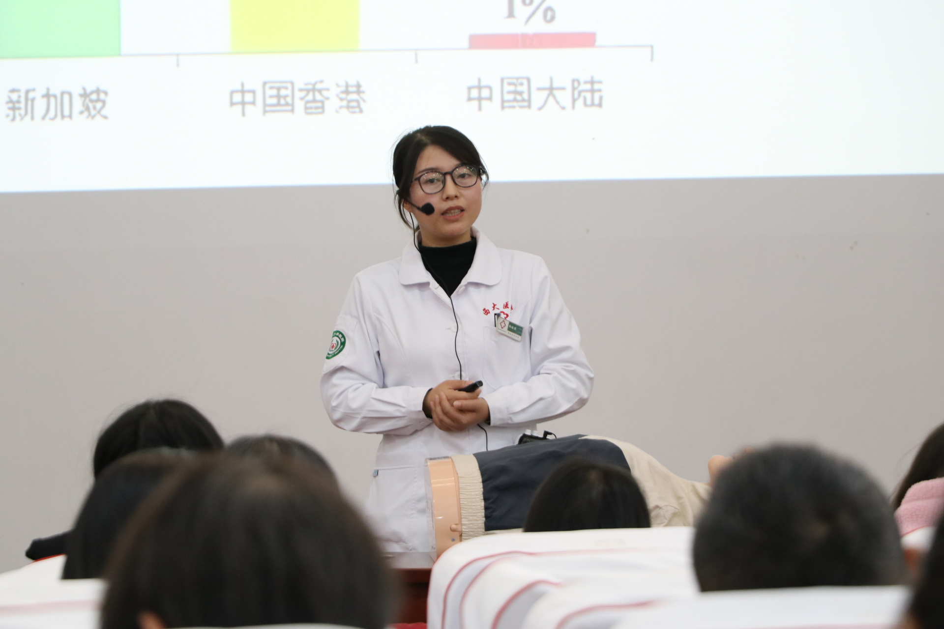 随后,主治医师宋雯茜进行了实验室应急救护理论讲解,内容涵盖急救创伤概论、创伤救护原则和流程、实验室烧伤和眼部外伤的救治以及动物咬伤等的处置。主管护师杜娅丽结合实际案例介绍了各类急救技术的适用场景,示范了心肺复苏术(CPR)和自动体外除颤仪(AED)的使用等技能。授课老师通过图文并茂的形式,生动展示了应急救护的重要性和实际操作步骤,并在实操环节利用人体模型进行演示,指导学员依次进行人工呼吸、心肺复苏等技能的模拟操作。