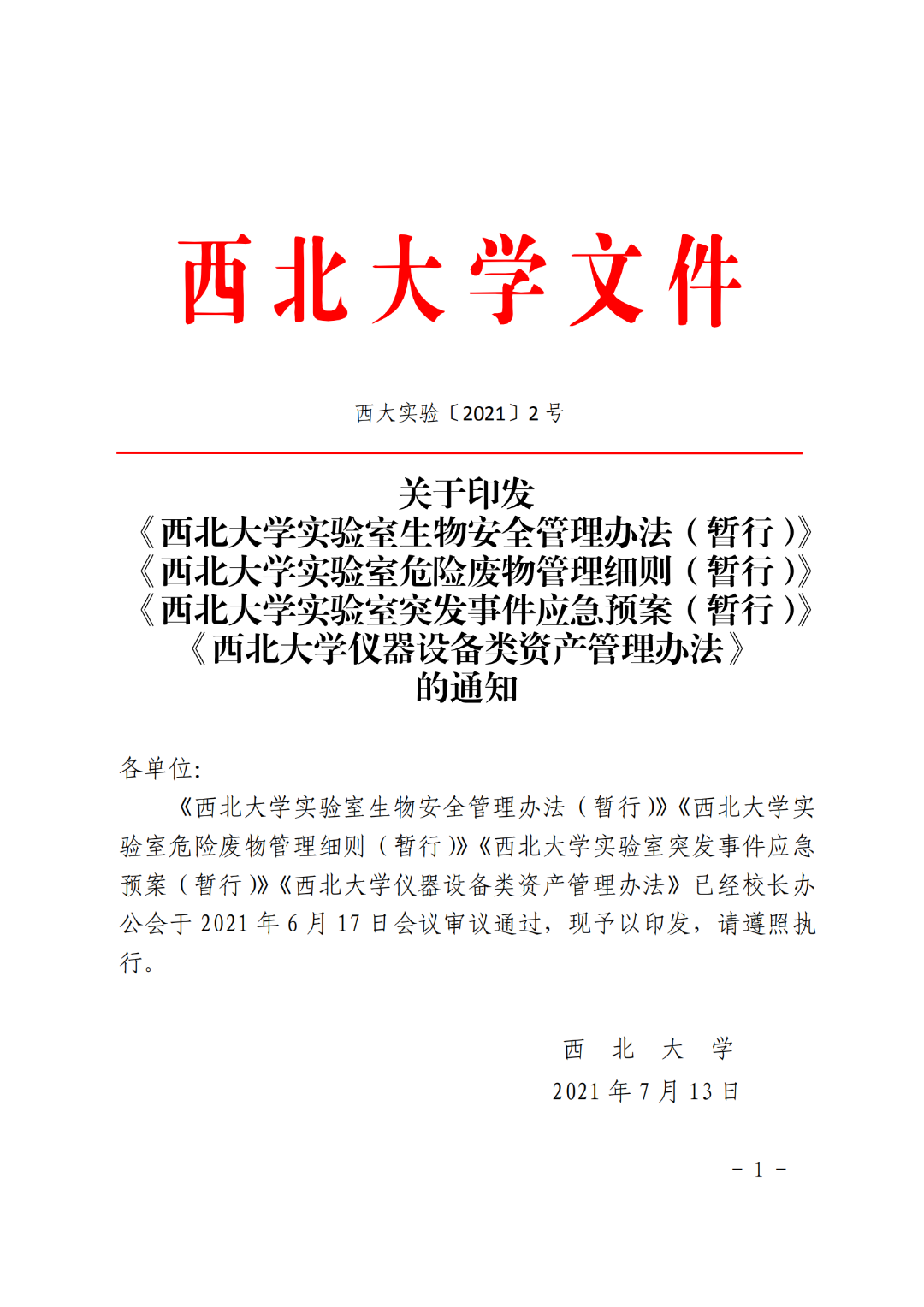 为加强学校仪器设备类资产管理,促进仪器设备资产科学配置、有效使用和规范处置,修订了《西北大学仪器设备类资产管理办法》(西大实验〔2021〕2号),形成权责明晰的运行机制,确保仪器设备资产管理规范有效开展,使学校资产管理有据可循,确保学校资产配置科学、管理规范、安全完整。