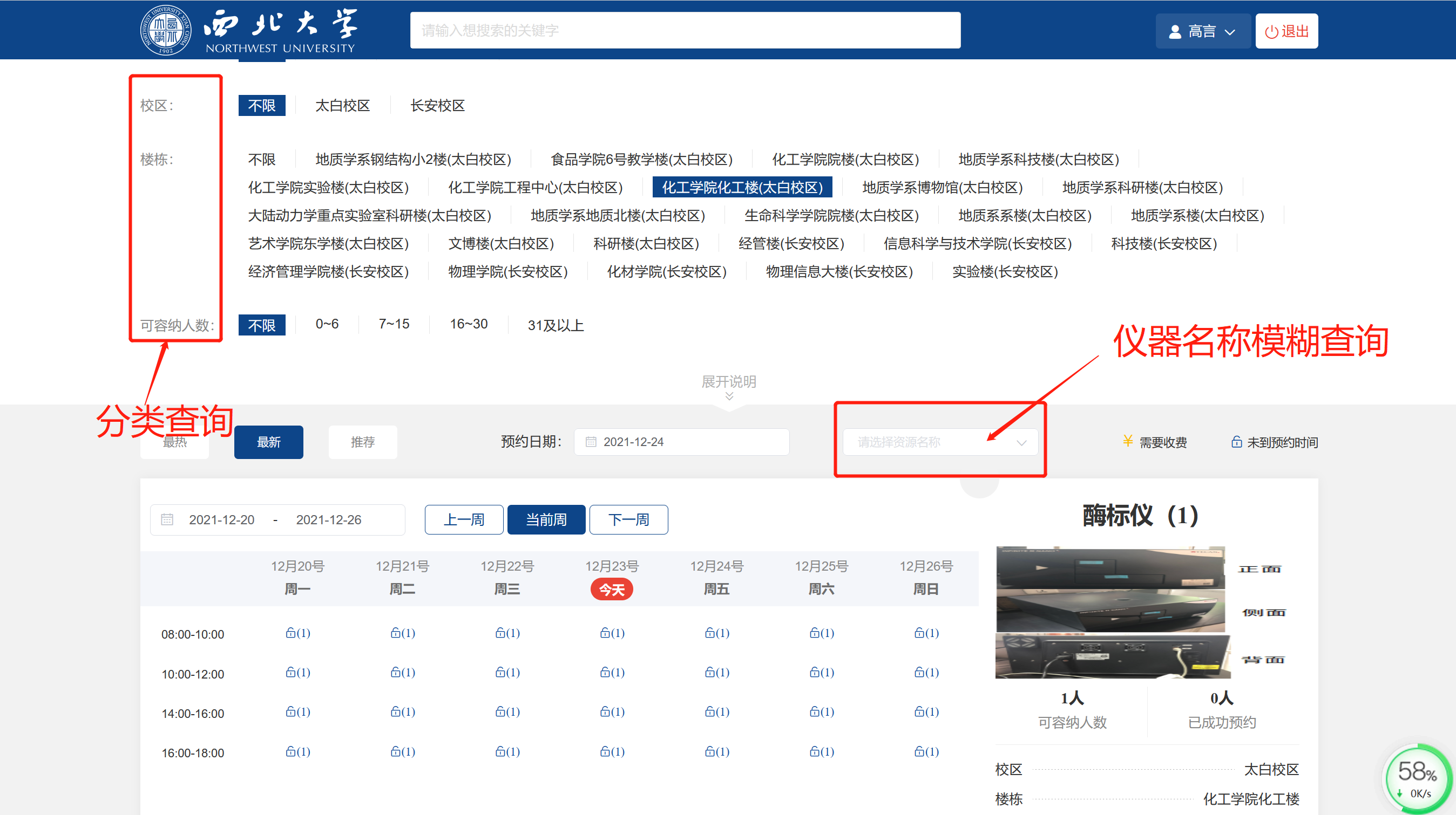学校推动优质资源共享,充分释放仪器设备潜能,制定出台大型仪器设备共享相关制度;更新完善《西北大学实验室贵重仪器设备信息手册》;按照务实、实效、分批次、分阶段的原则,搭建看得见、约得上、用的成的网约共享平台。该平台已于2021年12月30日上线运行,首次融合多个平台信息,联通共享渠道,使仪器设备资源在校内获得充分共享开放,发挥仪器设备优势,在资源相对约束的条件下充分挖掘实验室潜能。