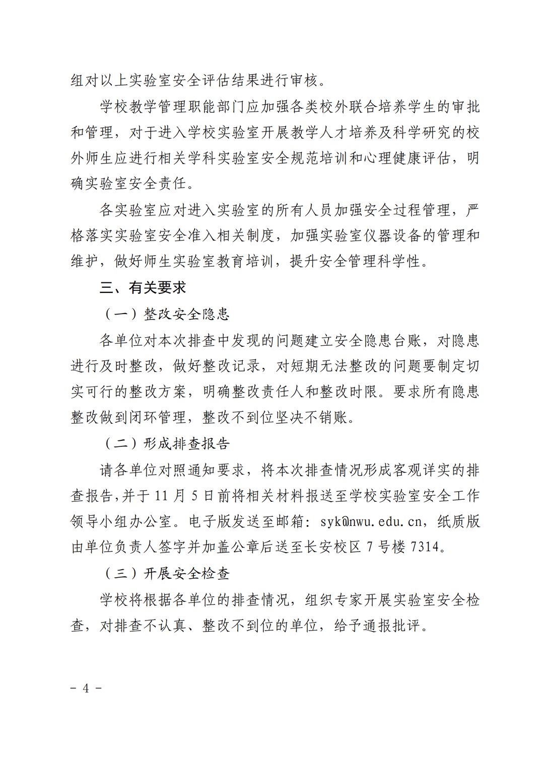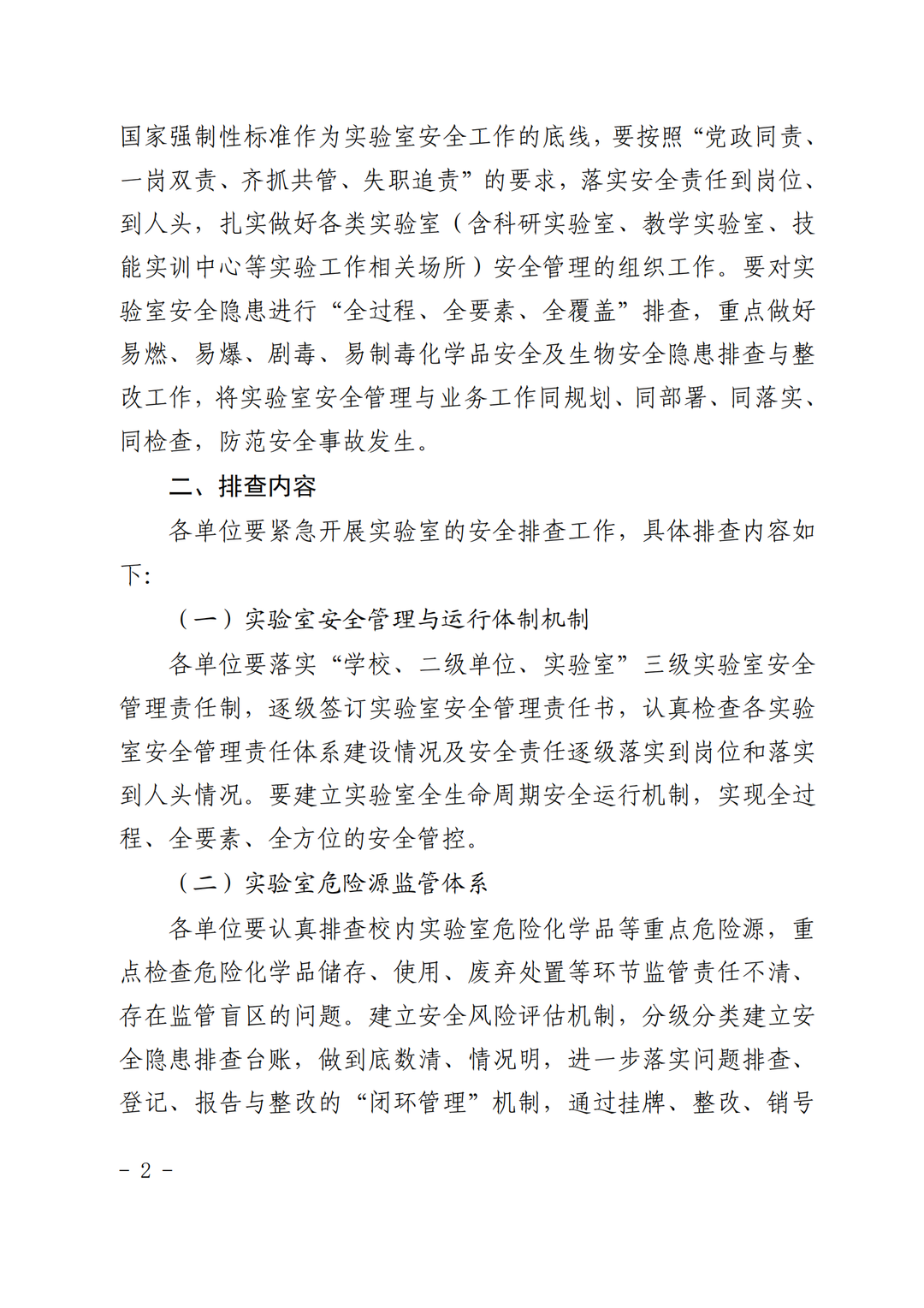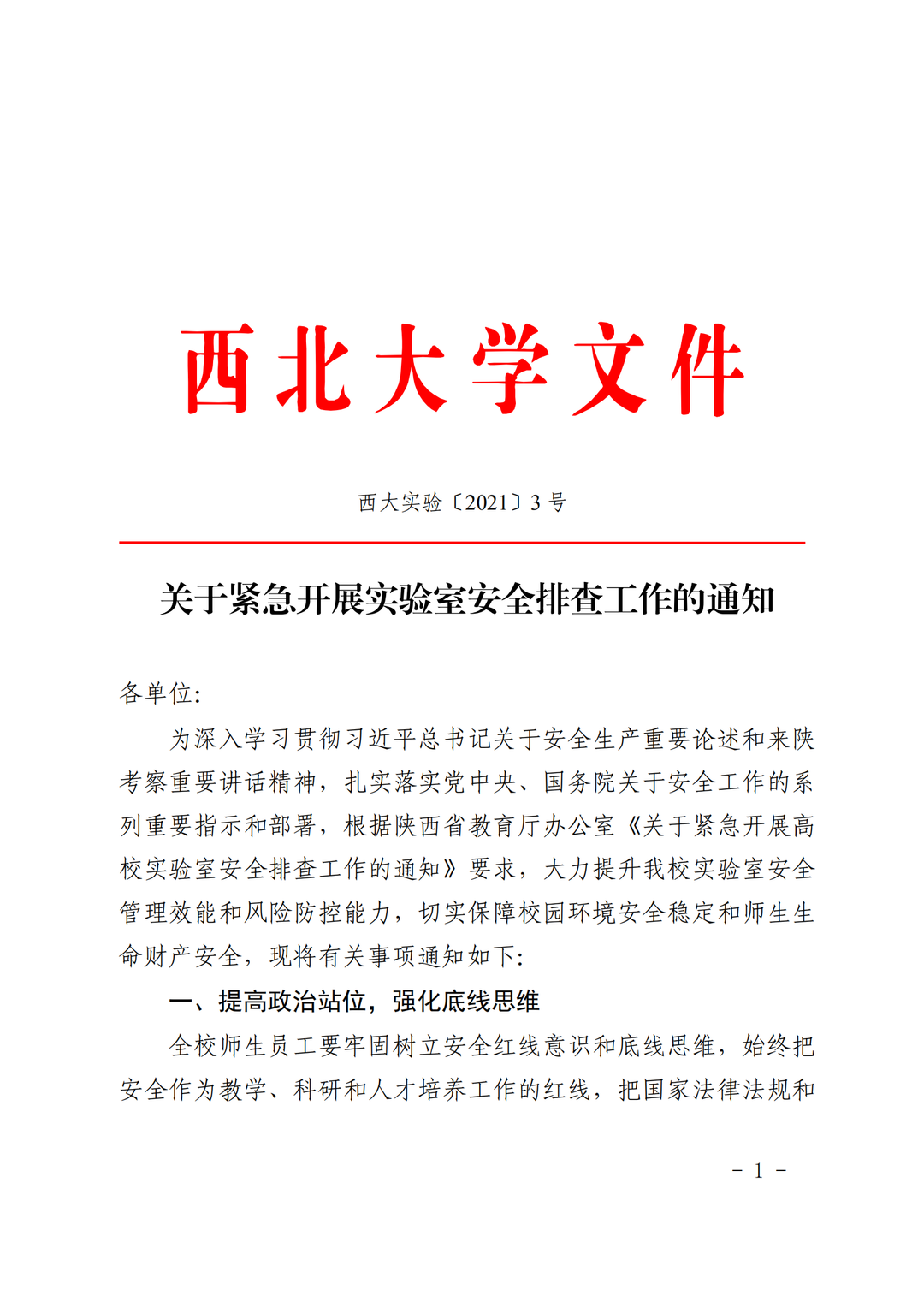 根据近期中省有关实验室安全的文件精神与要求,学校发布《关于紧急开展实验室安全排查工作的通知》(西大实验〔2021〕3号),要求全校师生始终把安全作为教学、科研和人才培养工作的红线,按照“党政同责、一岗双责、齐抓共管、失职追责”的要求,落实安全责任到岗位、到人头,扎实做好学校实验室安全工作。对实验室安全隐患进行“全过程、全要素、全覆盖”排查,将实验室安全管理与业务工作同规划、同部署、同落实、同检查,防范实验室安全事故发生。