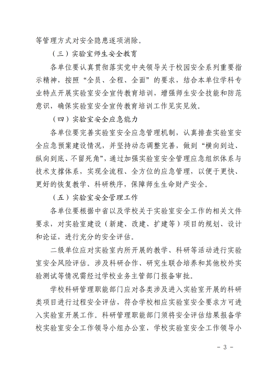 学校聚焦实验室安全,全方位、系统化推进实验室安全体系建设与管理。保持常抓不懈的工作韧劲,落实每月院系自查与学校检查机制;层层落实安全管理责任,确立校、院、实验室三级联动管理机制;持续提高安全保障能力,落实隐患整改的“闭环管理”;不断强化安全意识,营造良好的实验室安全工作氛围。
