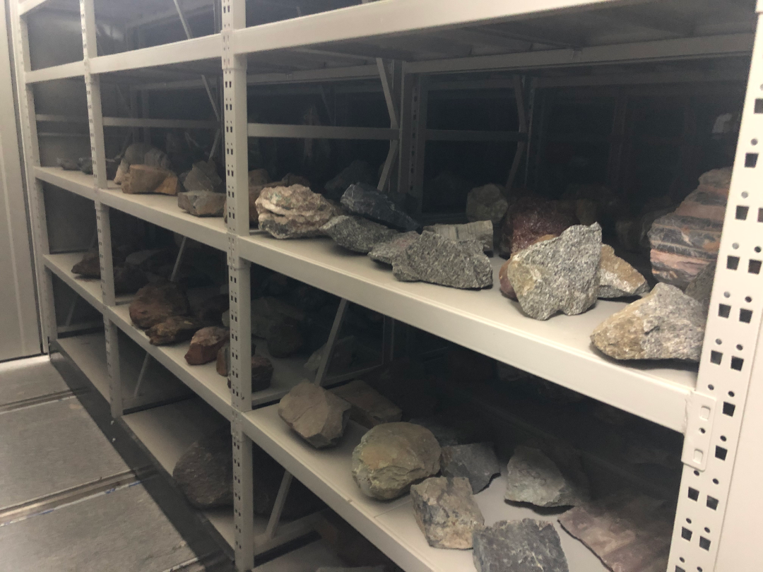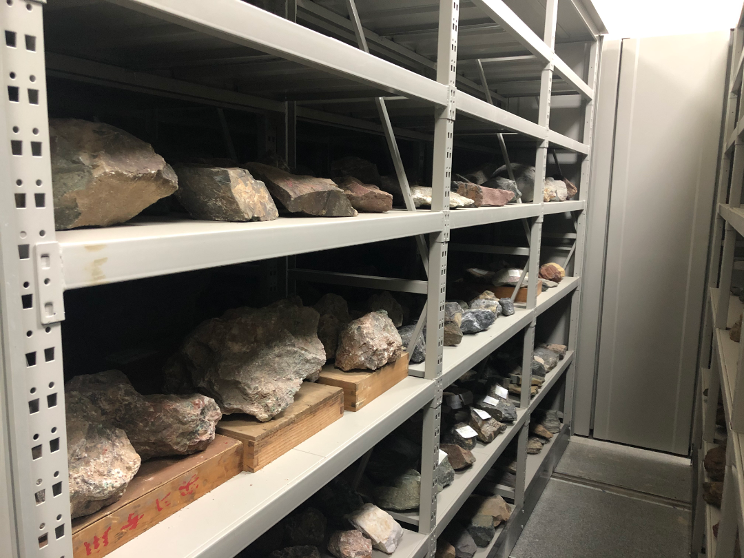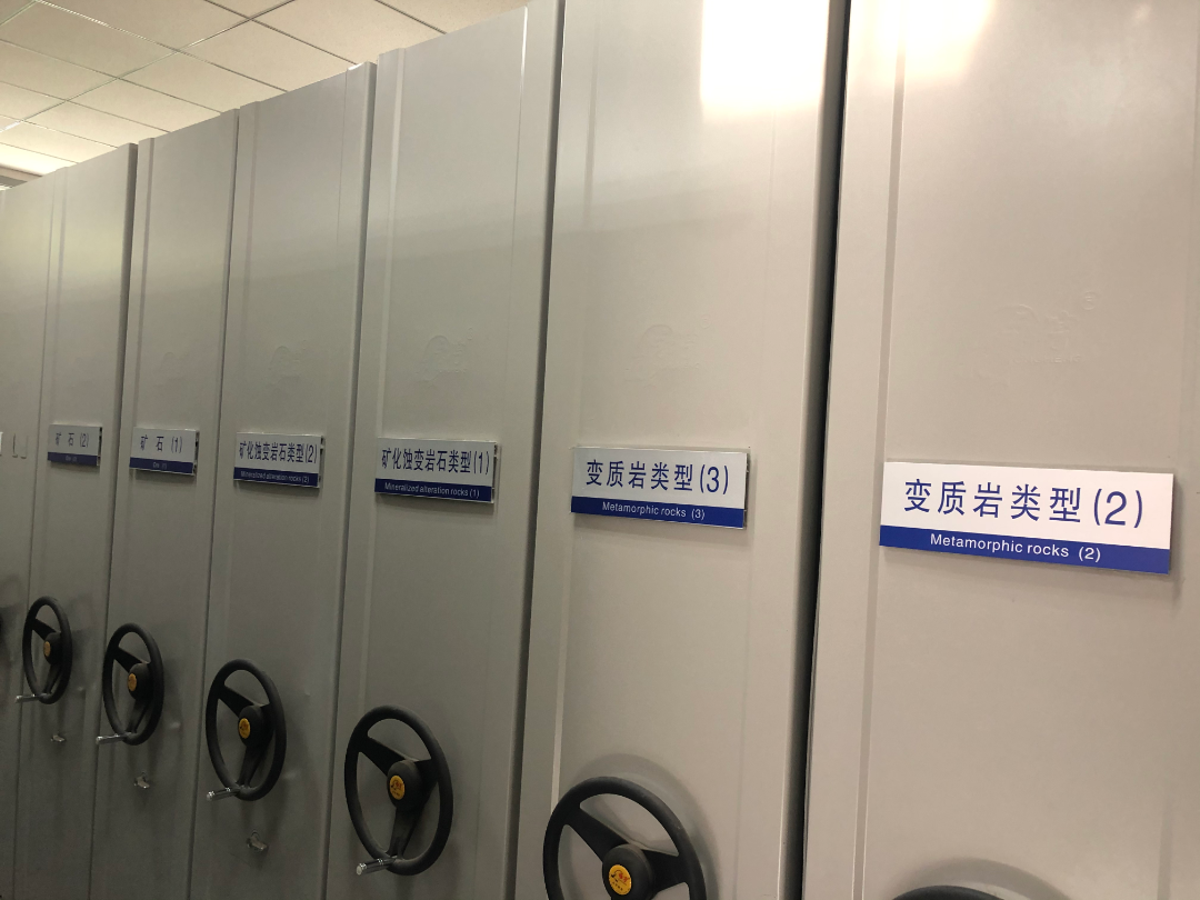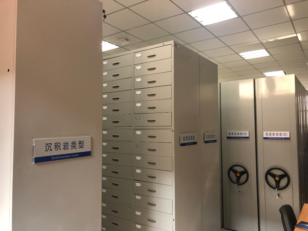 2016年标本库场地落实建成后,聘任两位有经验退休教师建设地质标本库至今。对已杂乱的几万件的地质标本从仓库回归地质楼,通过几年的辛勤工作,大致经历了“回归、整理、鉴定、入柜、建档、使用”六个阶段。回归:标本库实验室建设在系楼一层,将堆放在图书馆后院库房中的地质标本回归地质楼,建筑面积约300㎡。目前已完成了几万件地质标本准确鉴定和归档工作。整理:对脏乱无标签的标本进行肉眼鉴定、分类。鉴定:按岩石、矿石和古生物种属大类划分,标本经过清洗、鉴定、定名确定属性。入柜:2020年来围绕完成鉴定归档的工作外,对地质标本类型又进一步划分亚类按顺序入柜,并做了几次的调整,将大类的标本序列化,体现地质形成和成因意义。建档:在校系有关领导关心与过问下,两位老师对标本库进行系统管理,继续完成剩余标本鉴定工作的同时,对入柜标本按亚类进行反复调整,编排标本的电子版文件。使用:承担着教学科研任务,调取岩矿标本、古生物标本等用于加工薄片和调用手标本,已连续三年完成地质学系国家级实验教学示范中心相关实验工作。