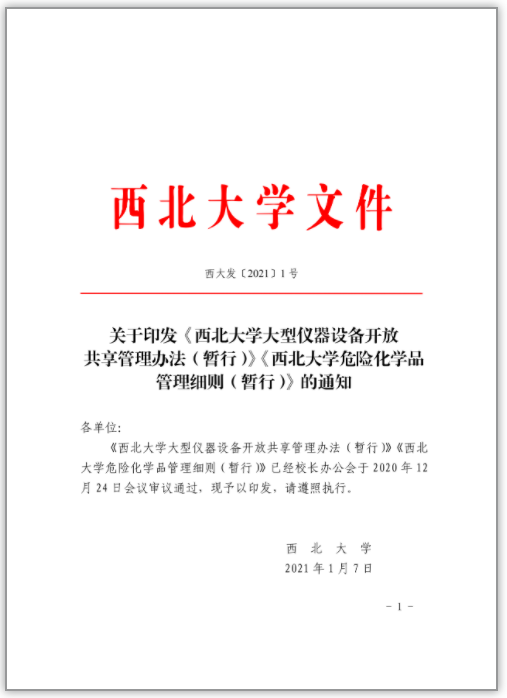 学校在深入院系积极走访、充分调研的基础上,结合试点工作情况,为进一步合理配置资源、提高仪器设备效率、效益,充分释放服务潜能,制定出台《西北大学大型仪器设备开放共享管理办法(暂行)》(西大发﹝2021﹞1号)。