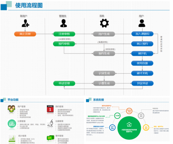 根据总体发展规划,结合“一院一策”改革思路,按照“开放共享、集约高效、避免浪费、有偿使用”的原则,学校构建适应不同学科特点的大型仪器设备开放共享服务体系,并定制研发安全可靠、实时高效、便捷普适的信息化管理平台。