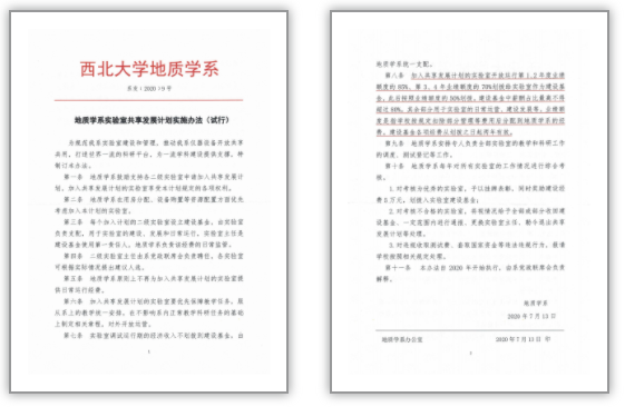按照国家有关文件新精神,学校积极“试点运行、逐步推进”大型仪器设备开放共享工作。依据专业学科特点,确定地质学系为试点“排头兵”单位先行先试,出台《西北大学地质学系实验室共享发展计划实施办法(试行)》(系发﹝2020﹞9号)文件及系列办法制度。经过近一年的试点运行,地质学系仪器设备共享工作初见成效。