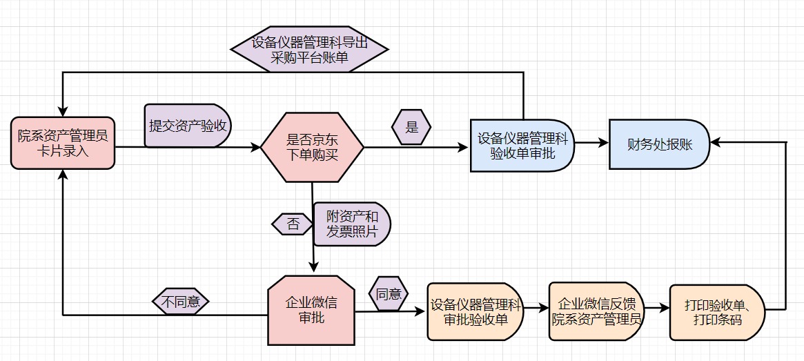1.各单位由资产管理员进行信息录入,打印验收单及设备条码,所有建账环节在本单位完成;