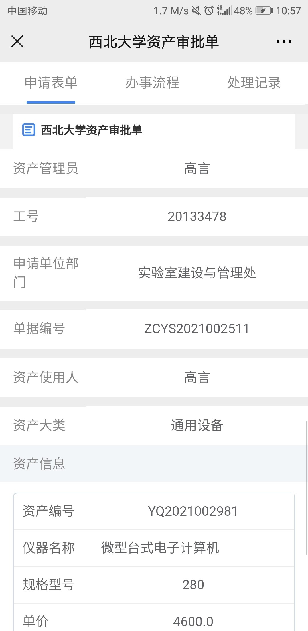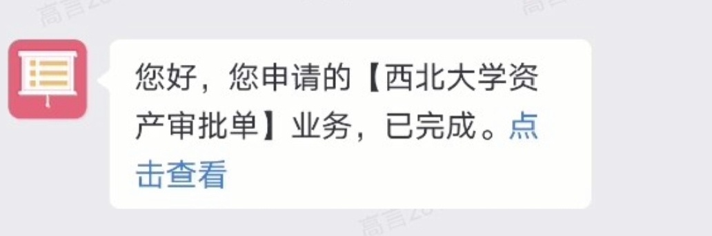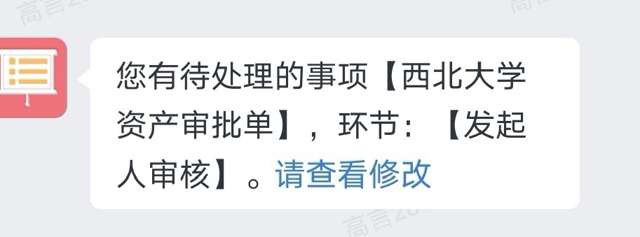 注意:若资产信息填写不正确,部门审批及归口部门验收审批环节的相关负责人均可以终止流程,并将审批结果发送至资产管理员,资产管理员可在“久其系统”中修改信息后重新提交。