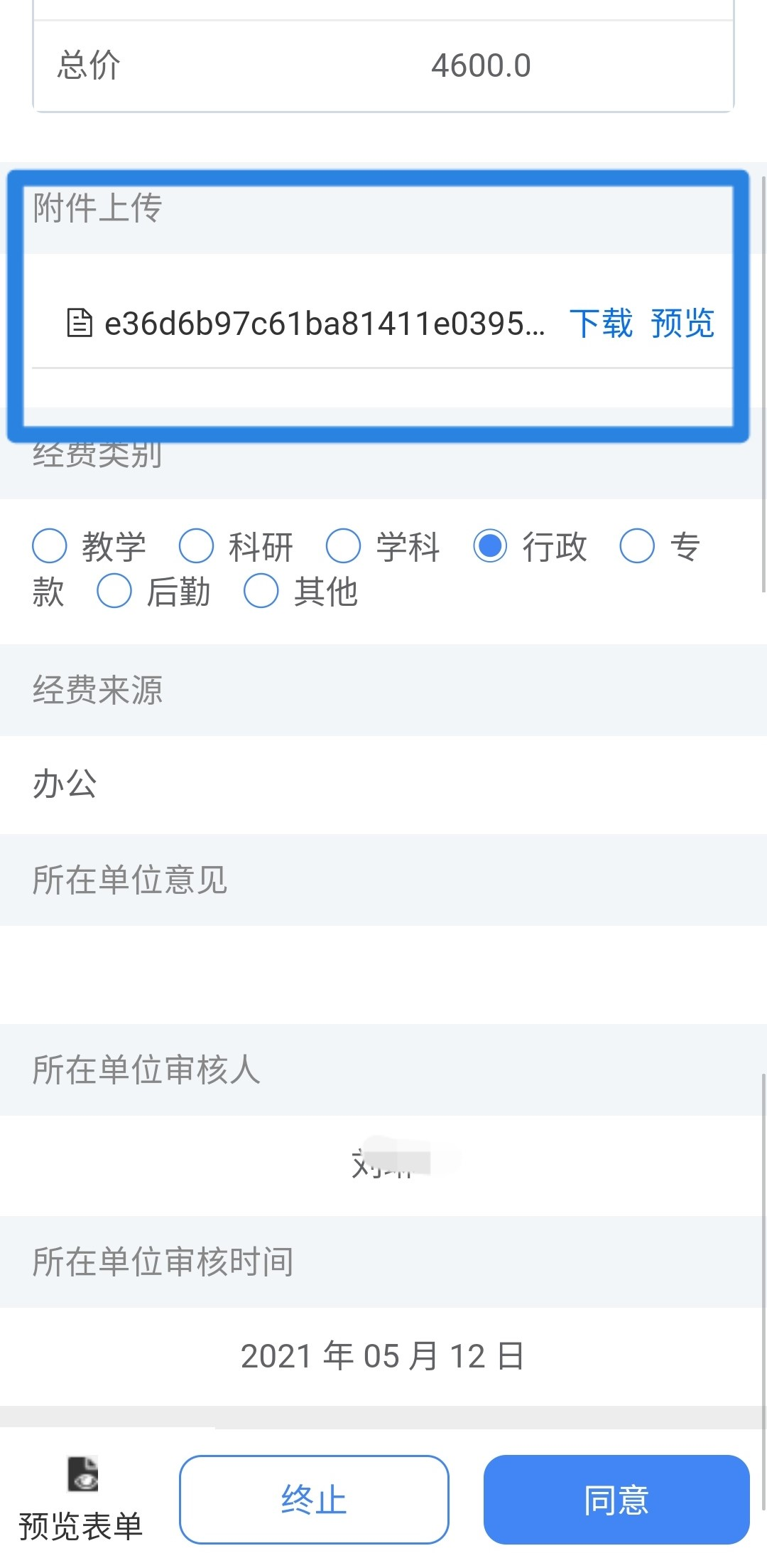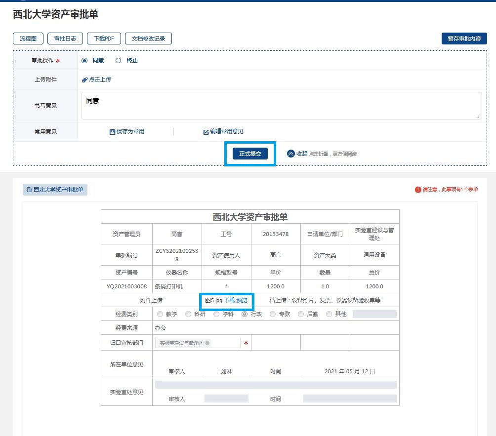 使用单位负责人登录网上办事大厅审核,在线查看附件设备信息,审批通过后将根据资产大类自动提交至相应归口管理部门进行验收单审批。