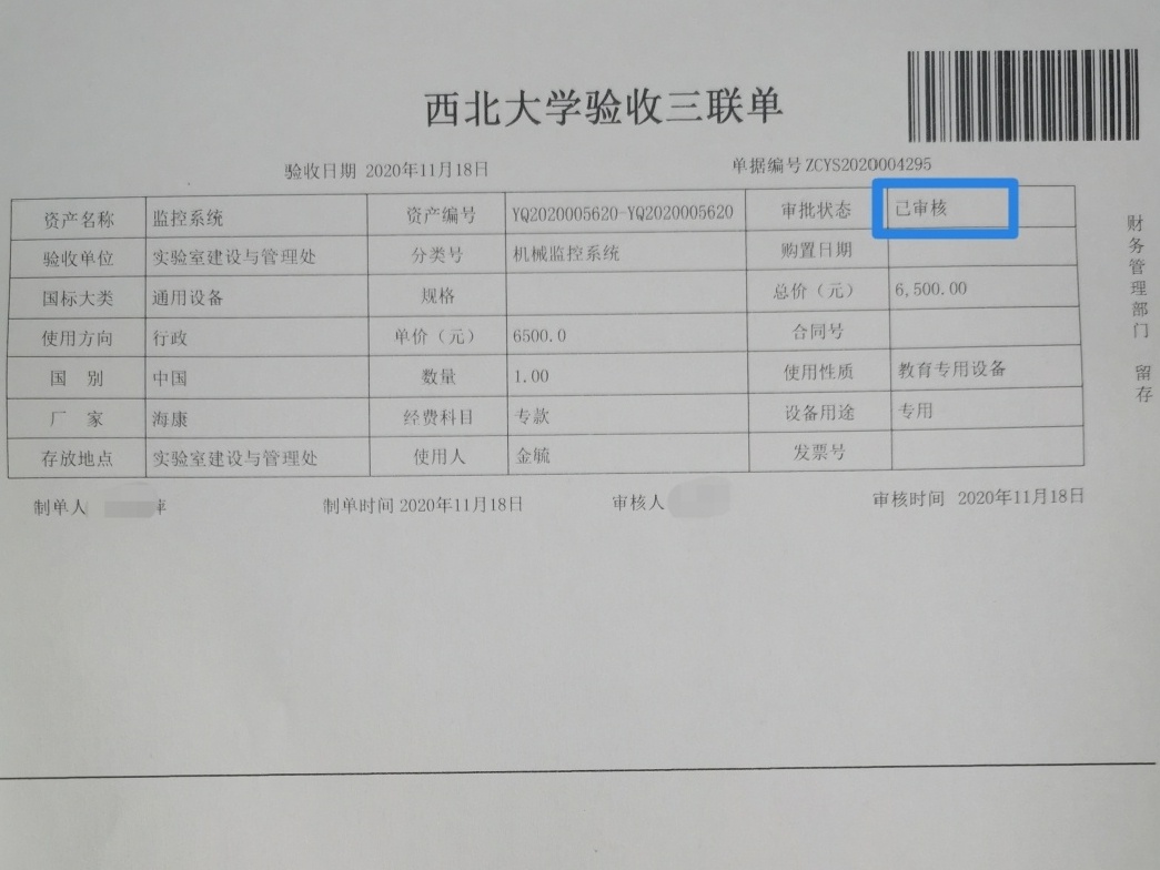 学校归口部门验收单审批完成后,将结果反馈至使用单位,资产管理员即可在“久其系统”中打印验收单及设备条码,完成资产建账。【温馨提示】:仪器使用人请及时完成设备条码张贴。