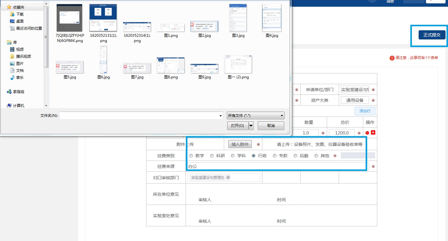 资产管理员登录网上办事大厅,核对录入信息,上传设备、发票照片,补充经费科目,完成后提交至本单位负责人审批。