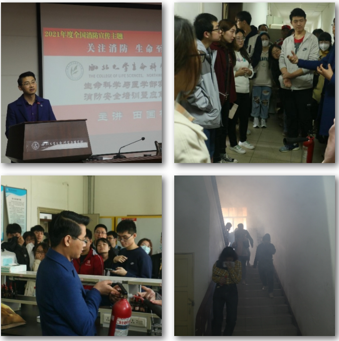 西安市圣安消防中心田国栋主任针对实验室消防安全进行专题讲座,并由相关工作人员组织指导消防紧急疏散演练。