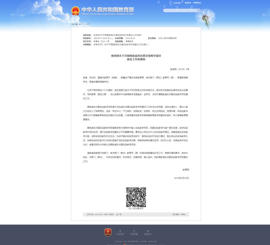 2018年5月30日,教育部为学习贯彻党的十九大精神,适应信息化条件下知识获取方式和传授方式、教和学关系等发生革命性变化的要求,深化信息技术与教育教学深度融合,经研究,决定开展国家虚拟仿真实验教学项目建设工作。