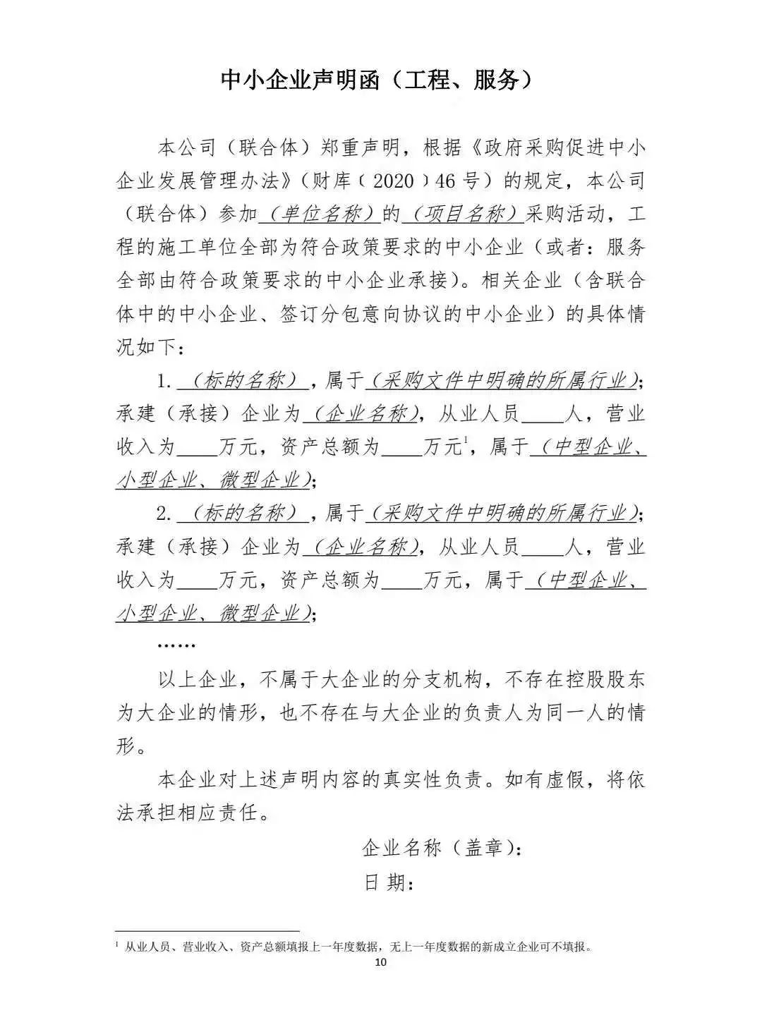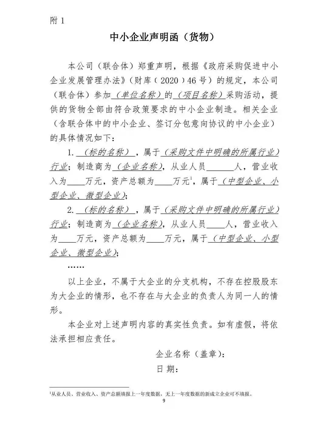 第十一条 中小企业参加政府采购活动,应当出具本办法规定的《中小企业声明函》(附 1),否则不得享受相关中小企业扶持政策。任何单位和个人不得要求供应商提供《中 小企业声明函》之外的中小企业身份证明文件。