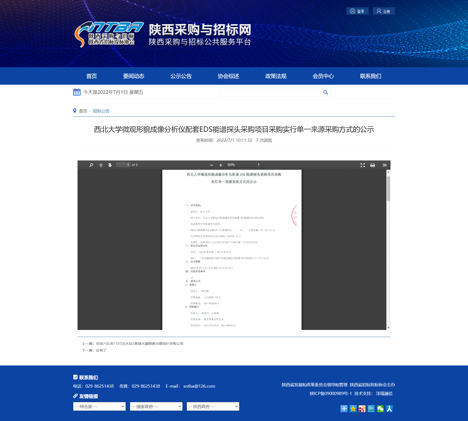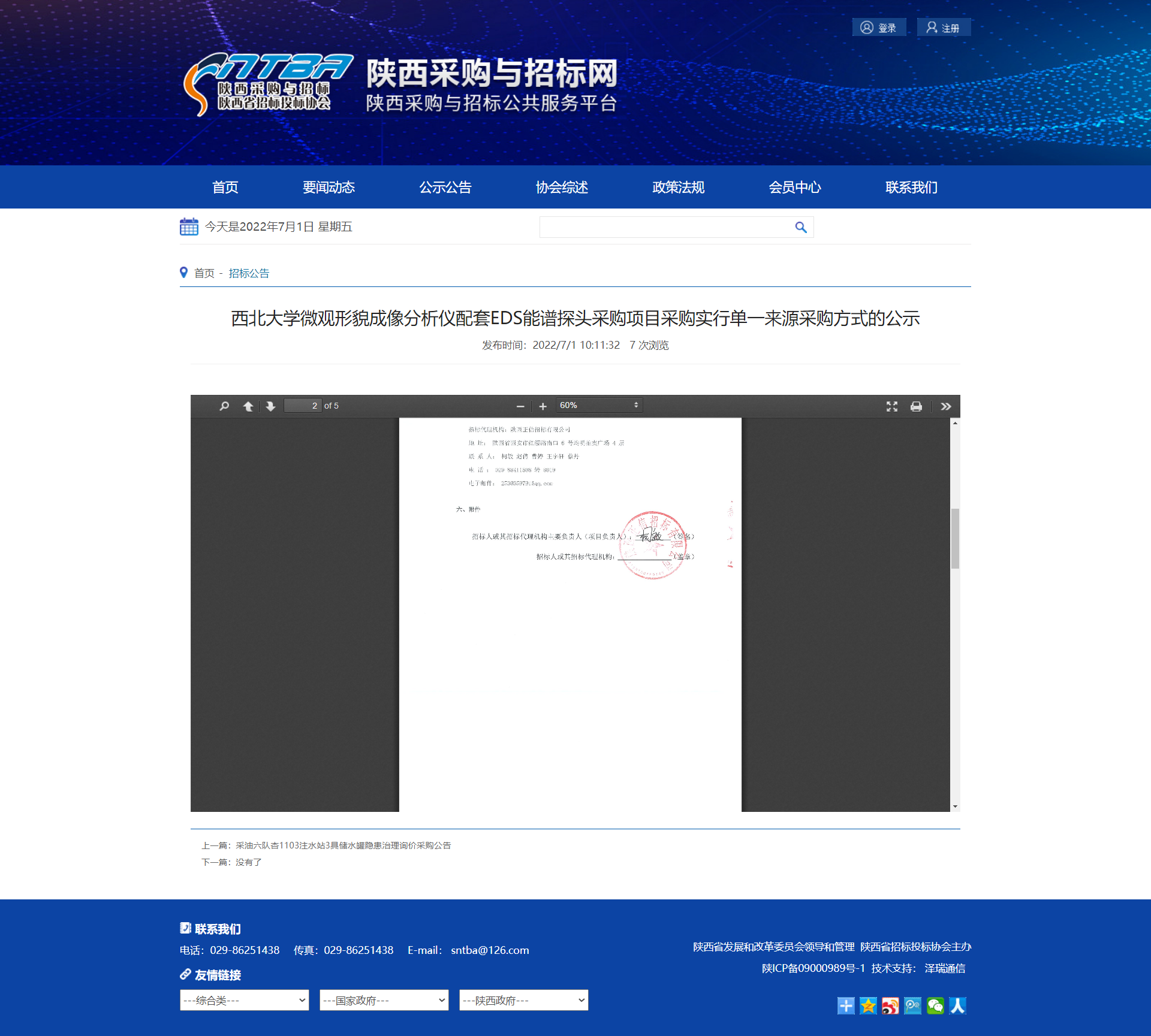 西北大学微观形貌成像分析仪配套EDS能谱探头采购项目采购实行单一来源采购方式的公示