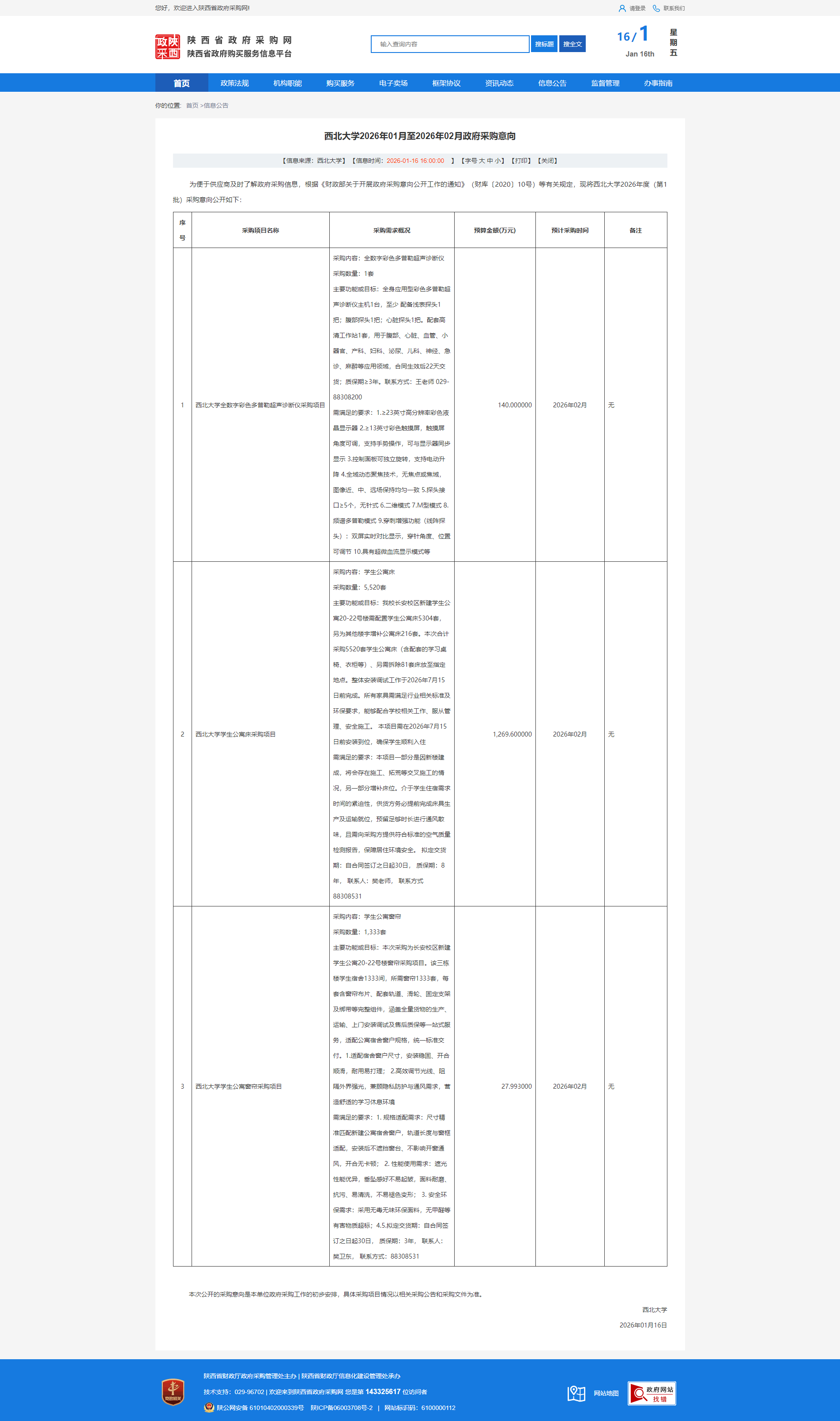 西北大学2026年01月至2026年02月政府采购意向