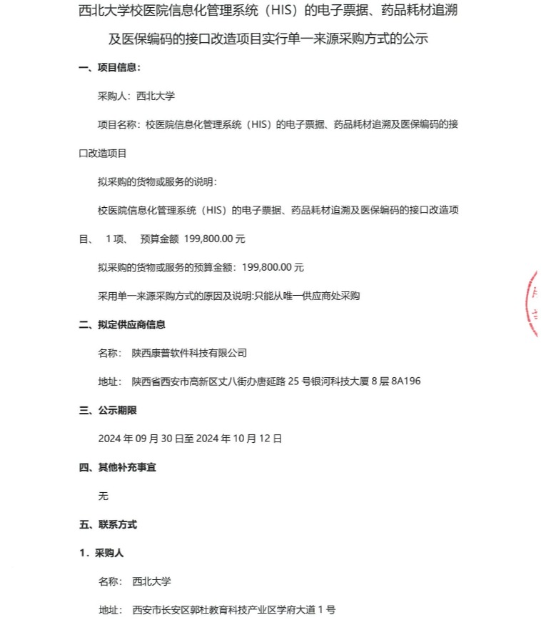 西北大学校医院信息化管理系统(HIS)电子票据、药品耗材追溯及医保编码接口改造服务项目实行单一来源采购方式的公示