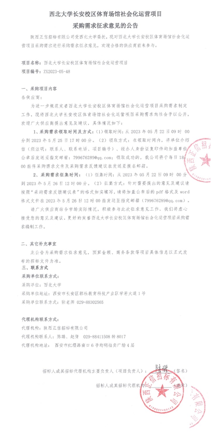 西北大学长安校区体育场馆社会化运营项目采购需求征求意见的公告