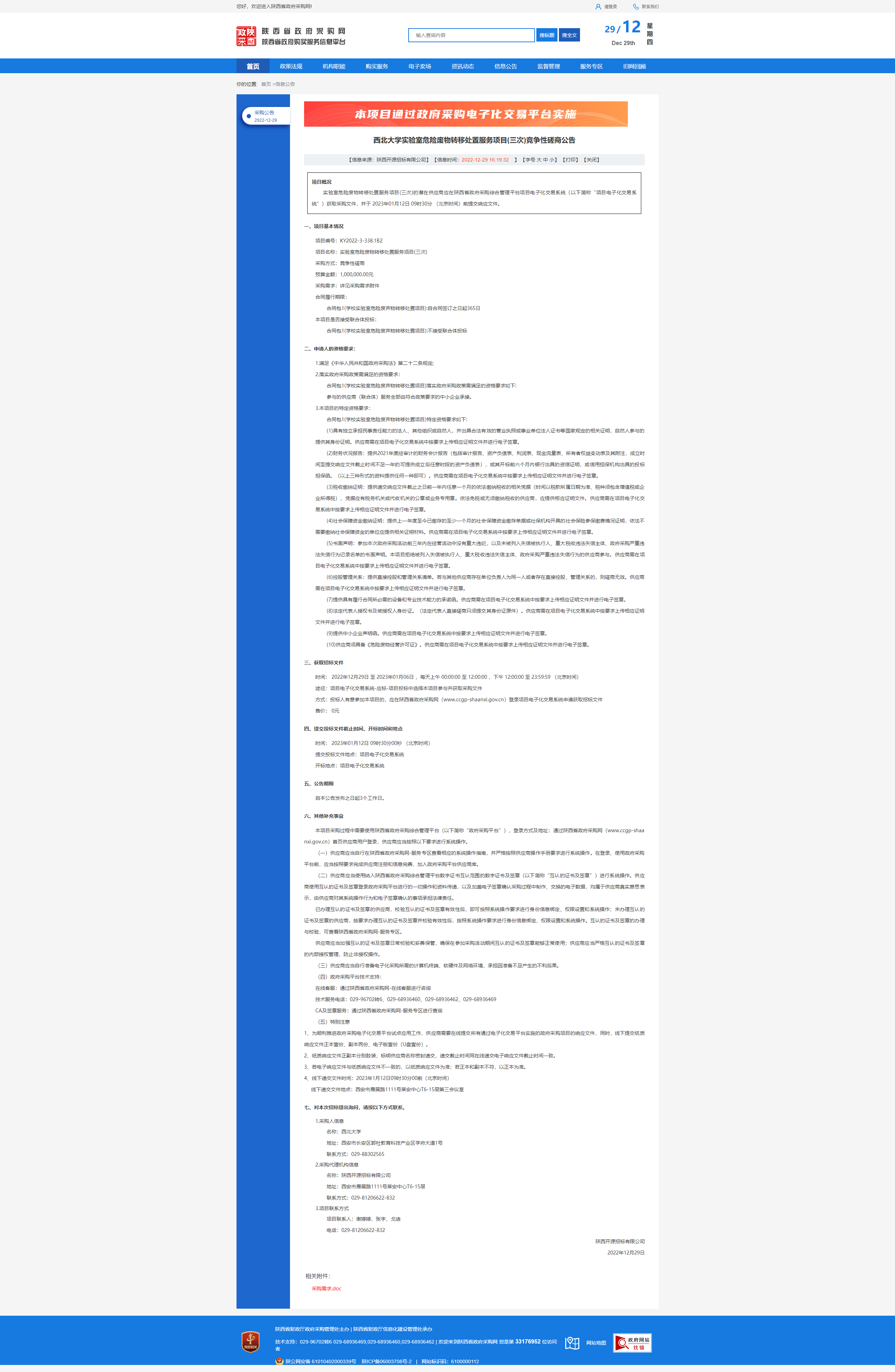 西北大学实验室危险废物转移处置服务项目(三次)竞争性磋商公告
