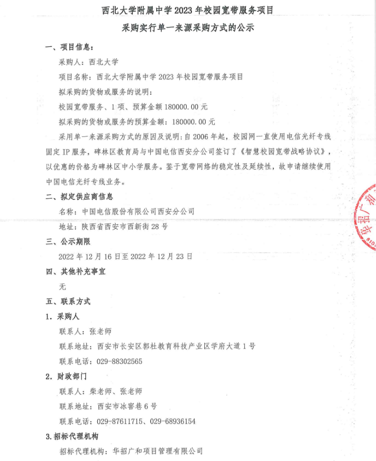 西北大学附属中学2023年校园宽带服务项目采购实行单一来源采购方式的公示