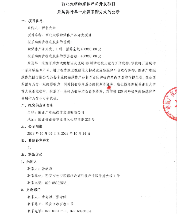 西北大学融媒体产品开发项目采购实行单一来源采购方式的公示