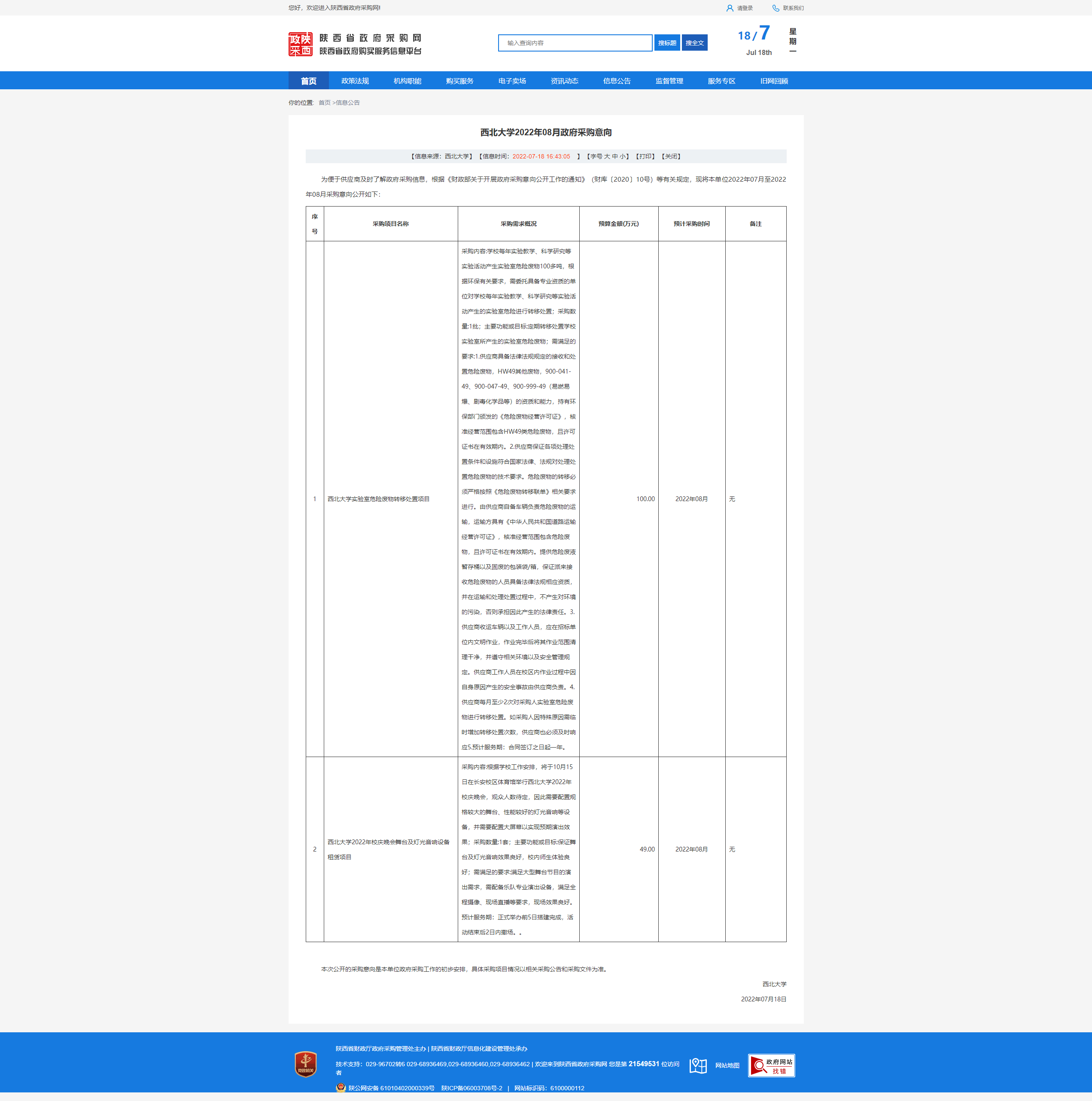 西北大学2022年08月政府采购意向