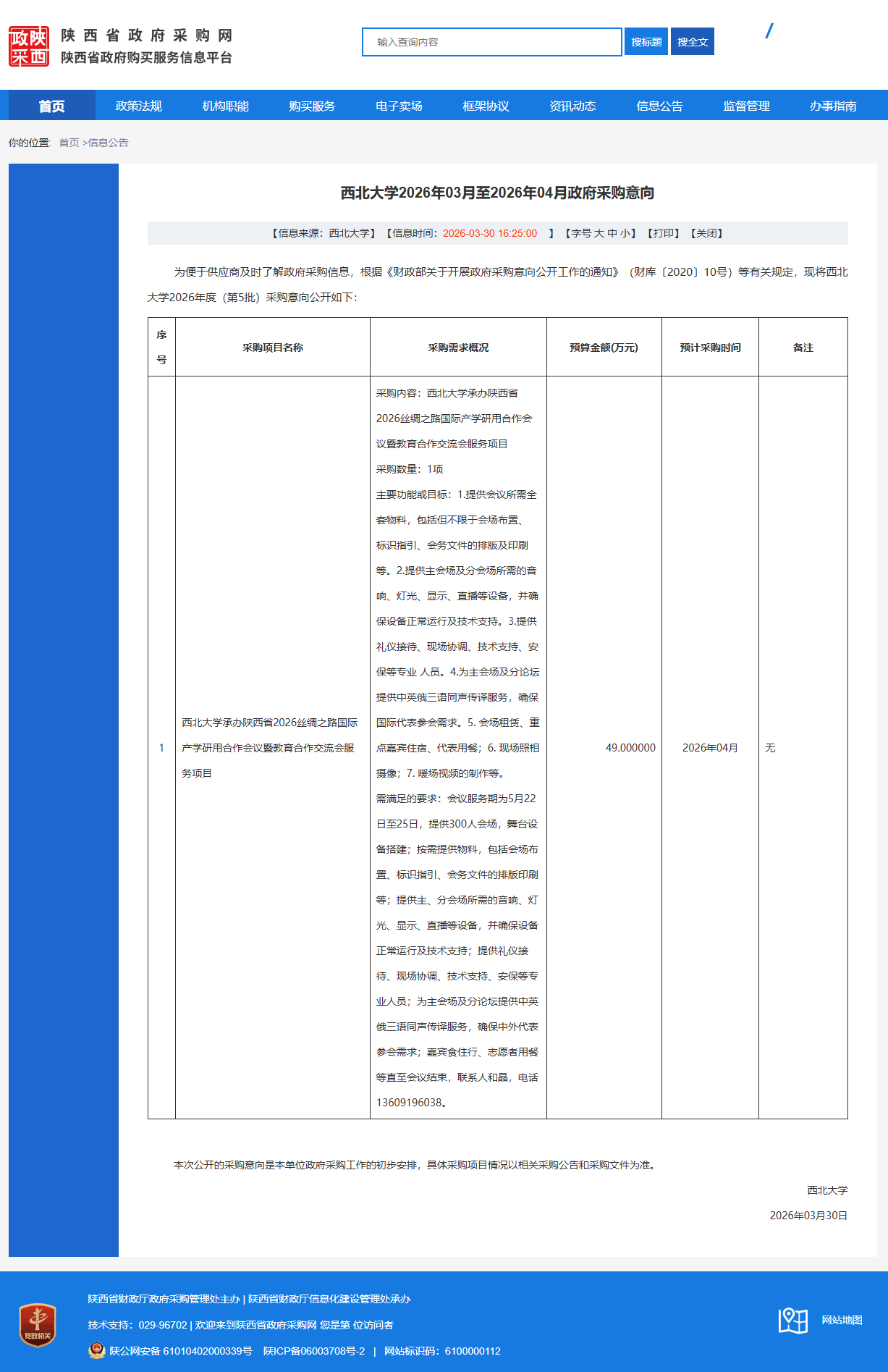 西北大学2026年03月至2026年04月政府采购意向