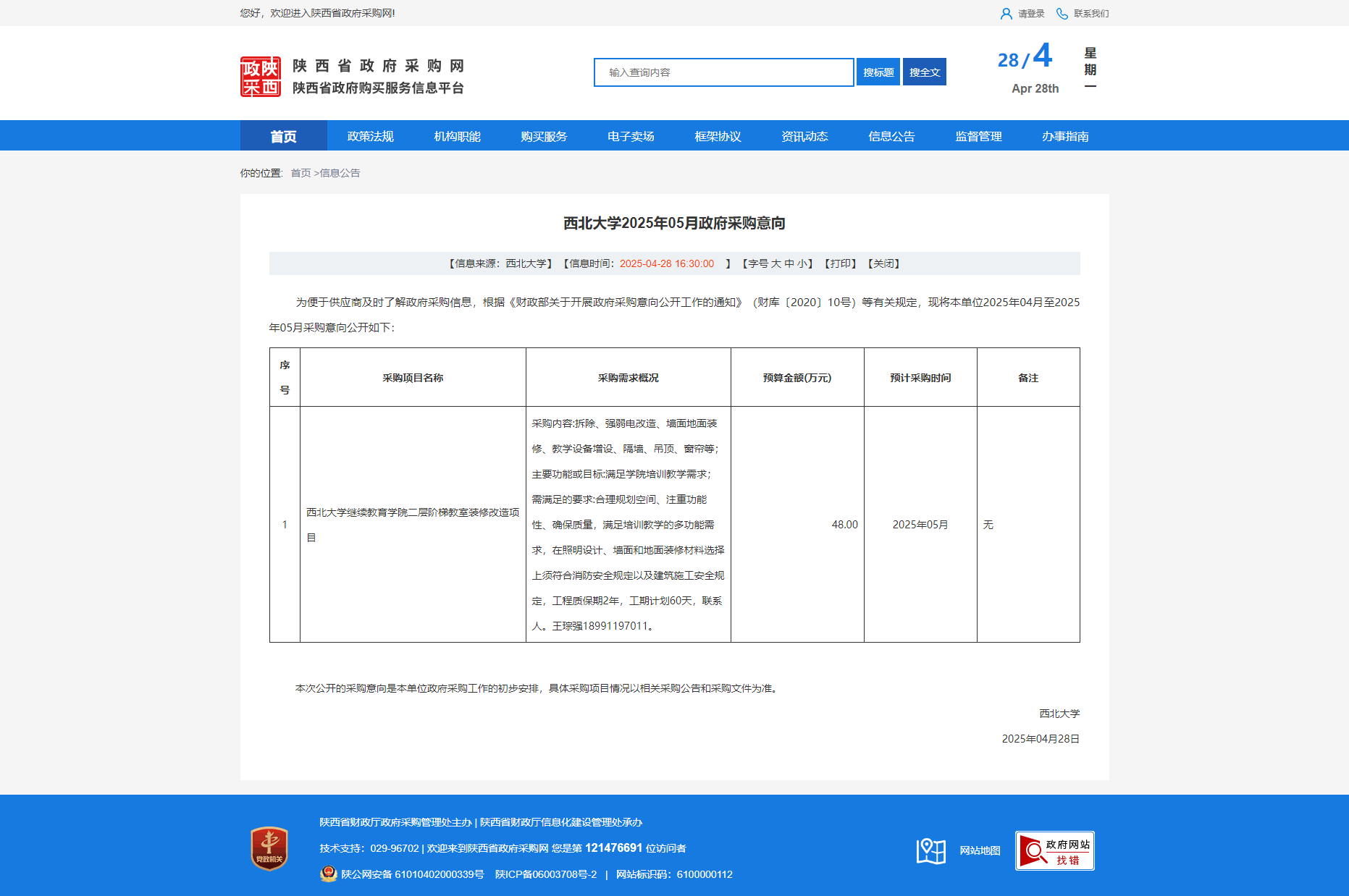 西北大学2025年05月政府采购意向