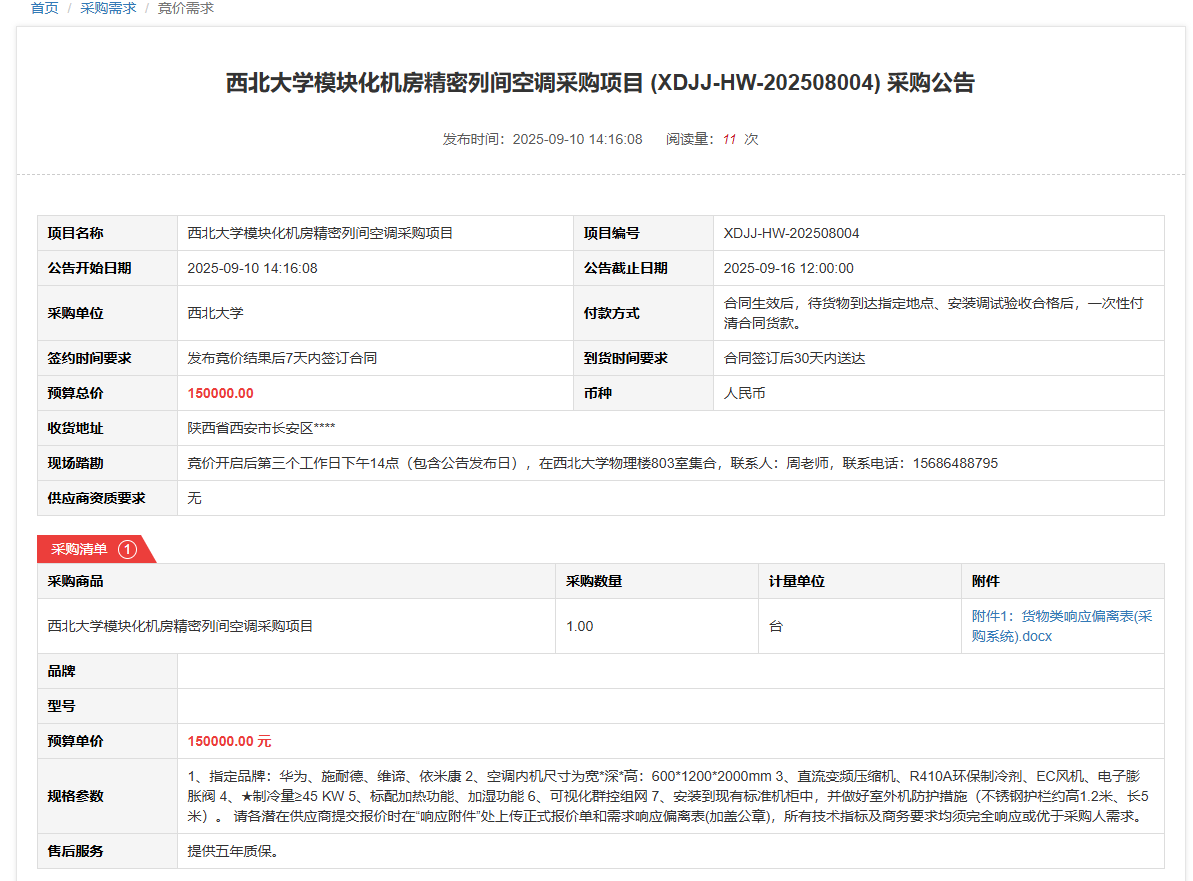 西北大学模块化机房精密列间空调采购项目(XDJJ-HW-202508004)竞价采购公告