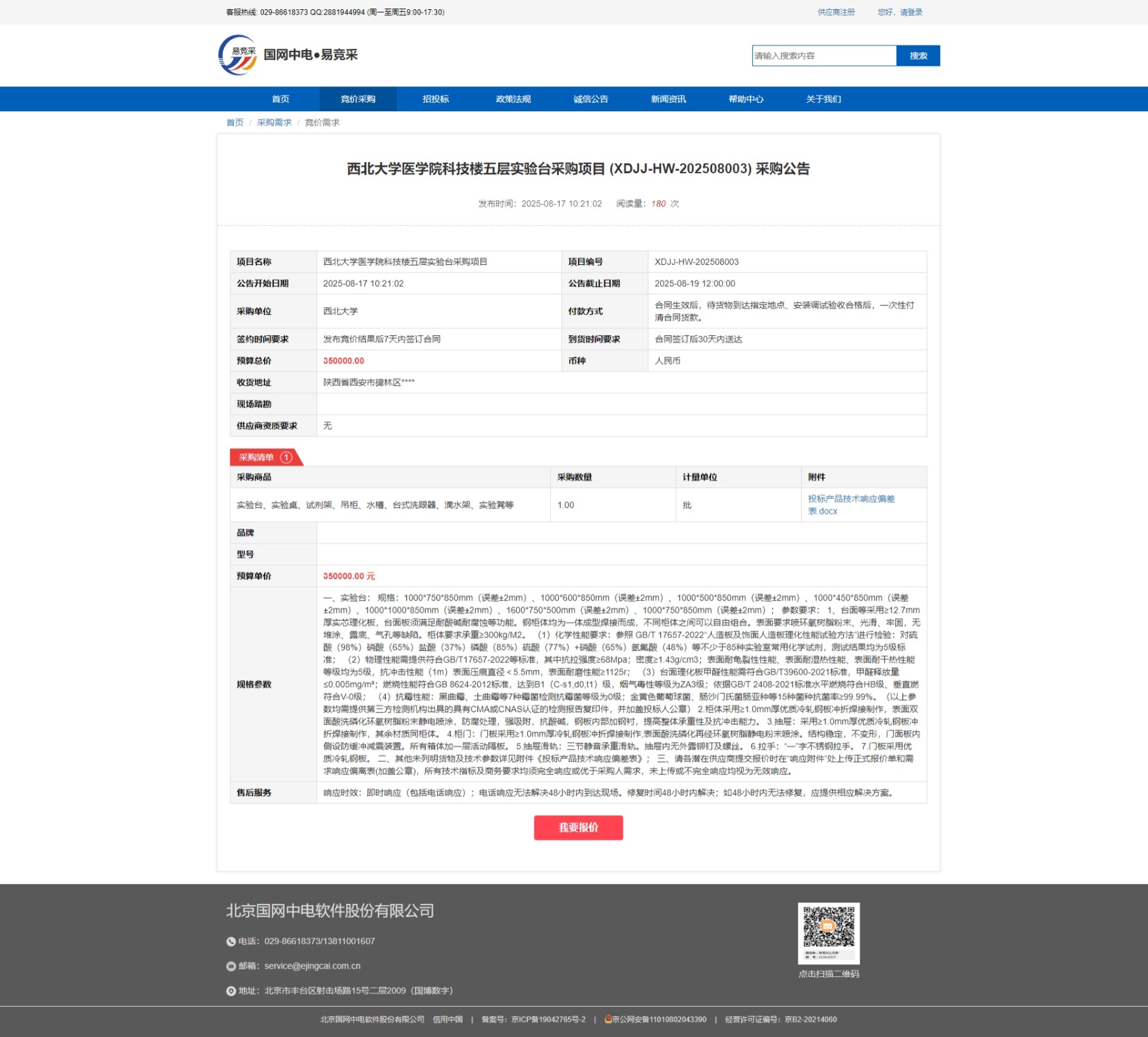 西北大学医学院科技楼五层实验台采购项目 (XDJJ-HW-202508003)竞价 采购公告