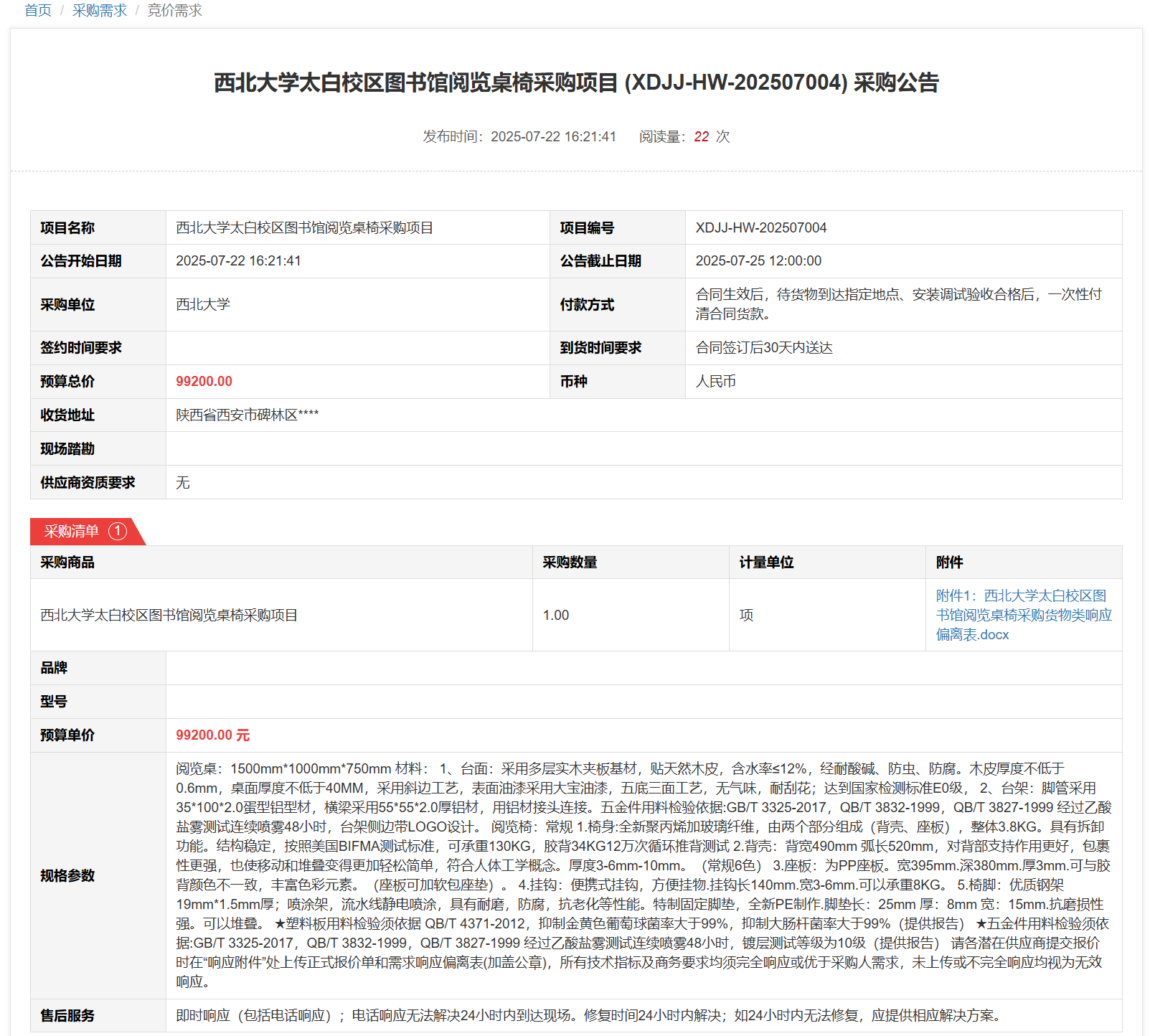 西北大学太白校区图书馆阅览桌椅采购项目(XDJJ-HW-202507004)竞价采购公告
