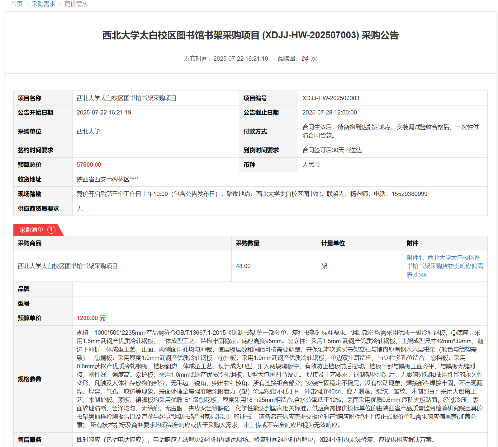 西北大学太白校区图书馆书架采购项目(XDJJ-HW-202507003)竞价采购公告