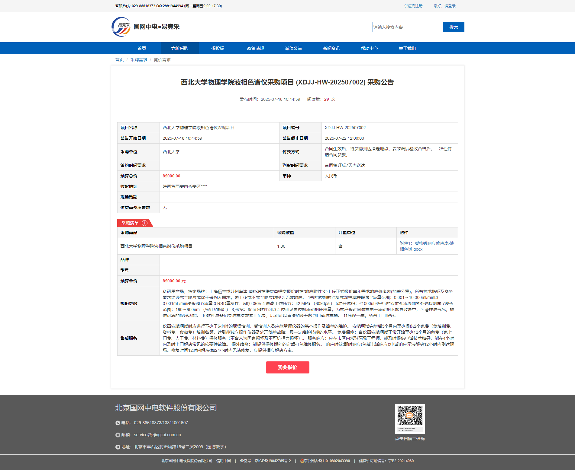 西北大学物理学院液相色谱仪采购项目 (XDJJ-HW-202507002) 采购公告