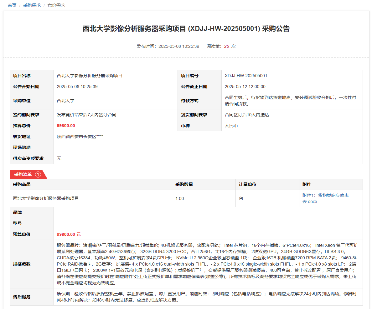 西北大学影像分析服务器采购项目(XDJJ-HW-202505001)竞价采购公告